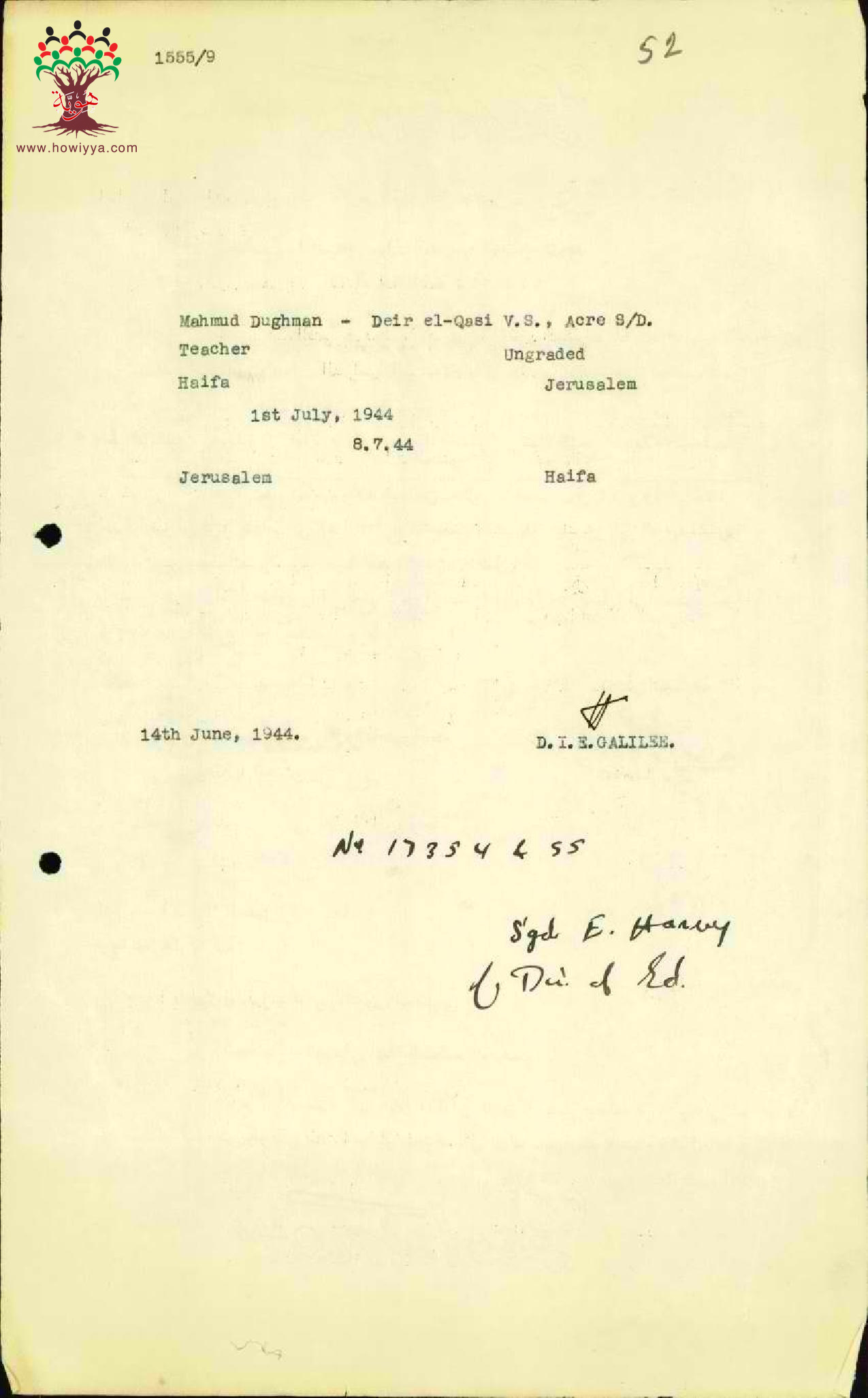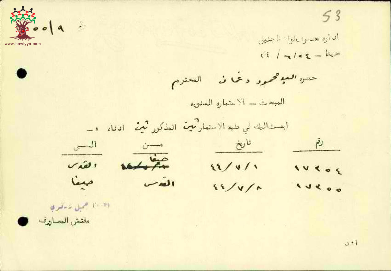 رسالة من مفتش المعارف الى المعلم محمود دغمان مرفقة باستمارة سفره