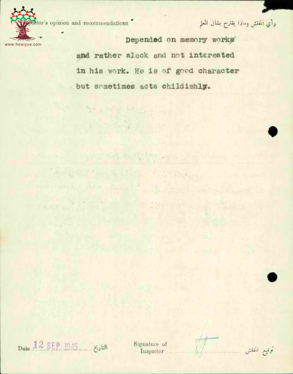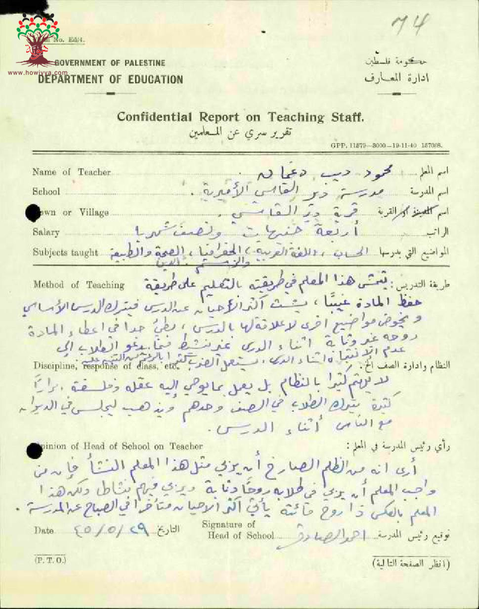تقرير تفصيلي عن أداء المعلم محمود ديب دغمان في مدرسة دير القاسي سنة 1945