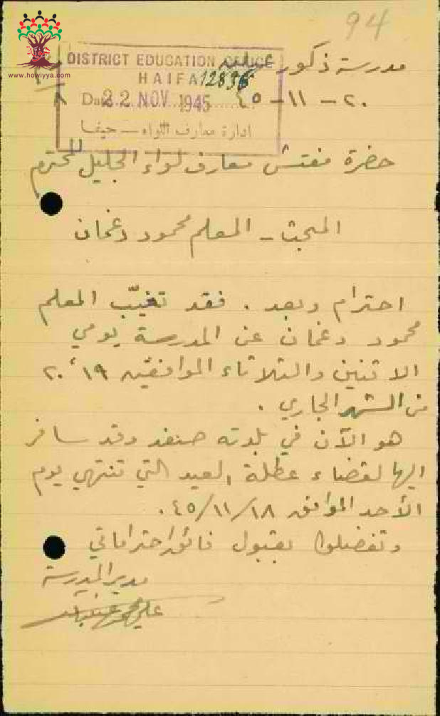 رسالة من مدير مدرسة عبلين الى مفتش المعارف بخصوص تغيب المعلم محمود دغمان قبل عطلة العيد