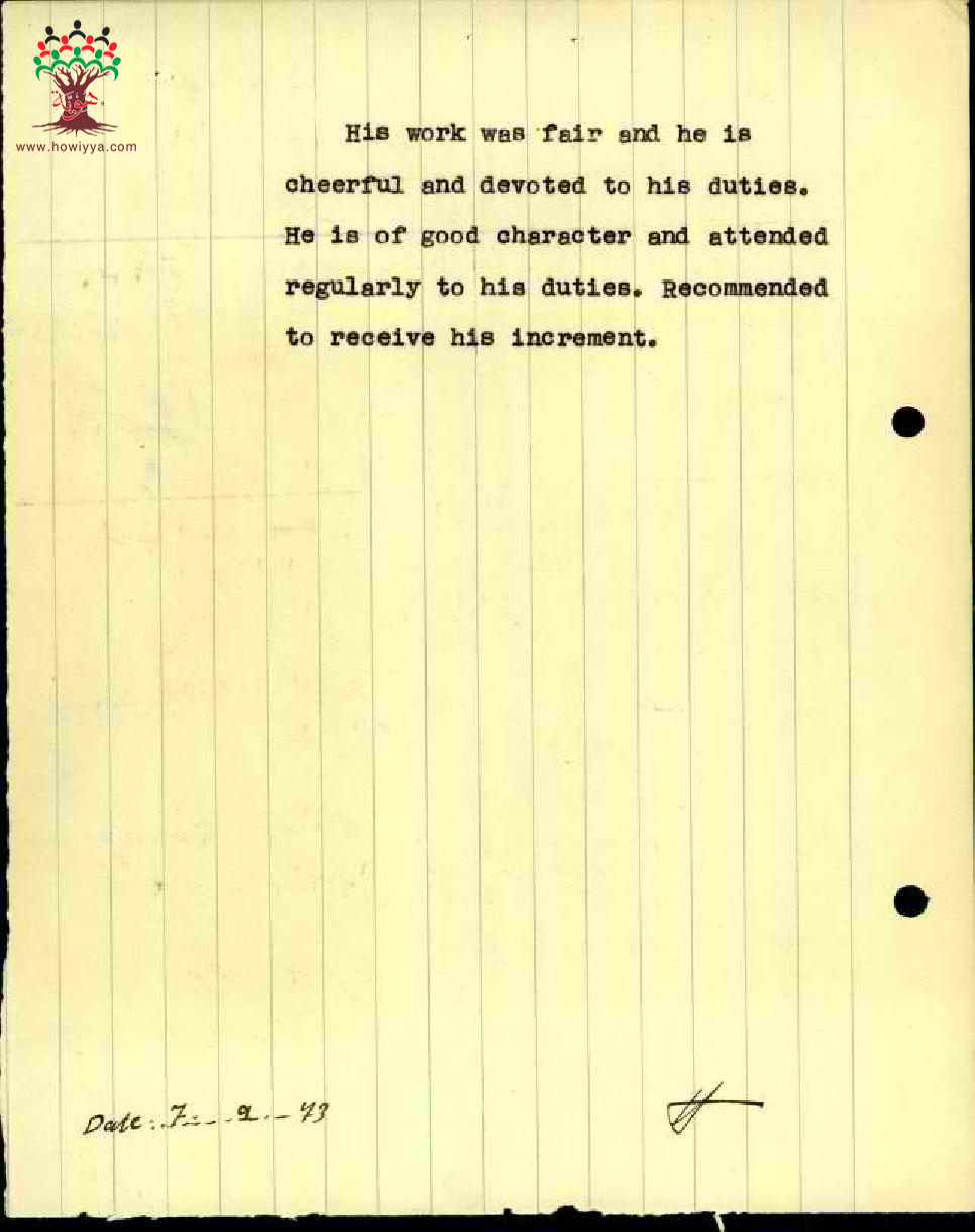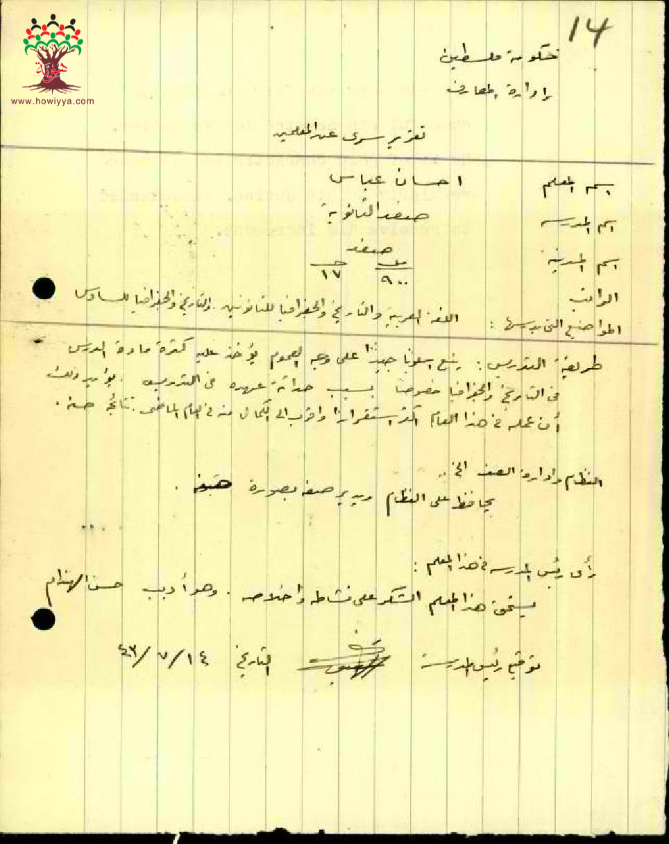 تقرير تفصيلي عن أداء المعلم إحسان عباس في مدرسة صفد الابتدائية سنة 1943