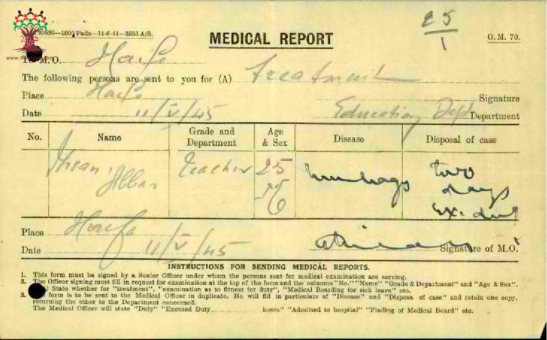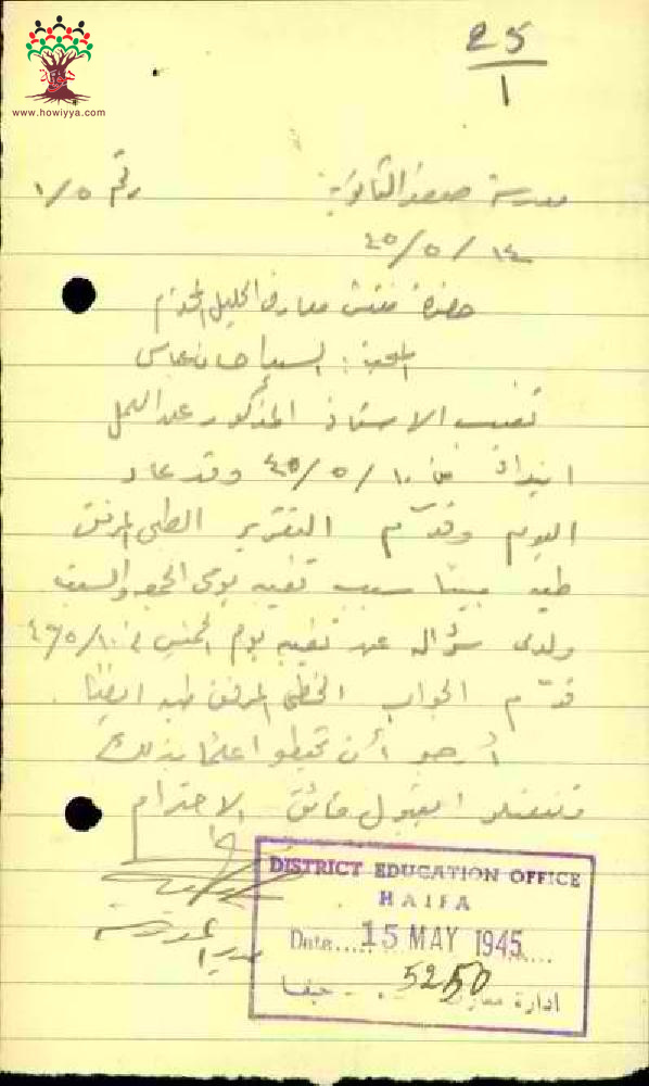 رسالة من مدير مدرسة صفد الى مفتش المعارف بخصوص تغيب المعلم إحسان عباس مرفقة بالتقرير الطبي