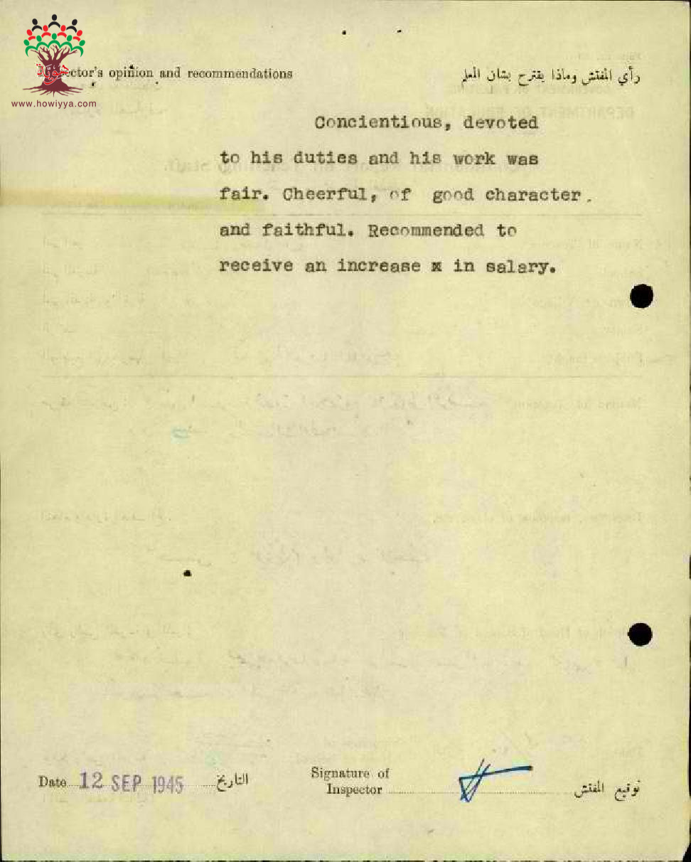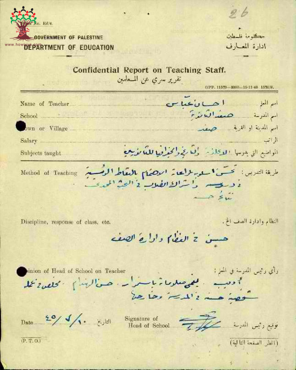 تقرير تفصيلي عن أداء المعلم إحسان عباس في مدرسة صفد الابتدائية سنة 1945