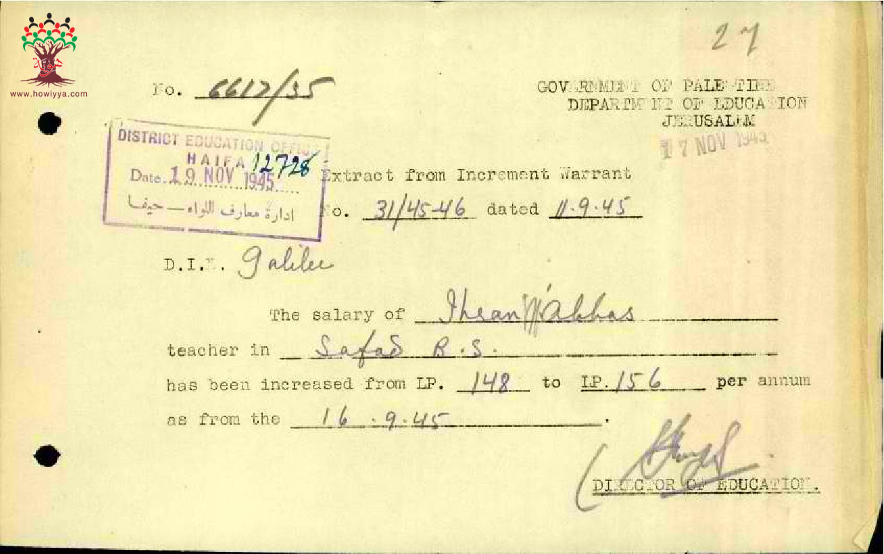 رسالة من مدير المعارف الى مفتش المعارف بخصوص زيادة راتب المعلم إحسان عباس السنوية