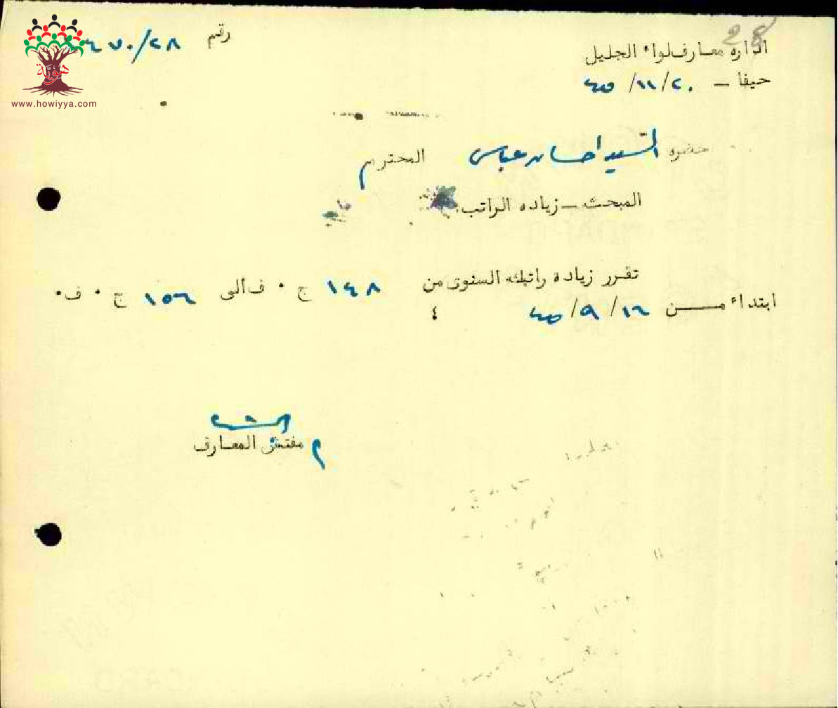 رسالة من مفتش المعارف الى المعلم إحسان عباس بخصوص زيادة راتبه السنوية