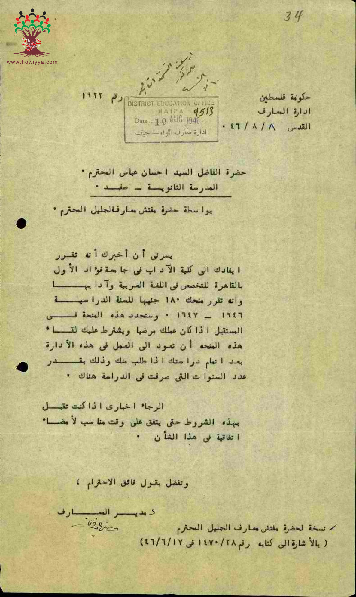 رسالة من مدير المعارف الى المعلم إحسان عباس يخبره بالموافقة على ايفاده بمنحه دراسية الى مصر