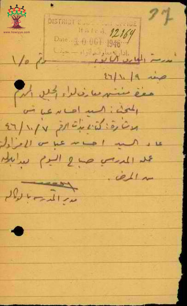 رسالة من مدير مدرسة صفد الى مفتش المعارف بخصوص عودة المعلم إحسان عباس الى العمل