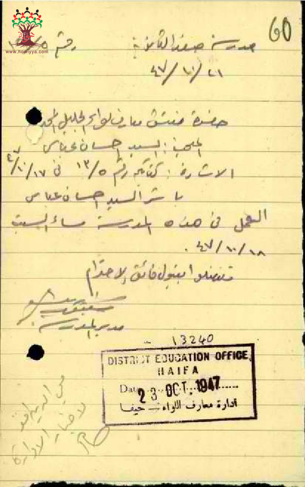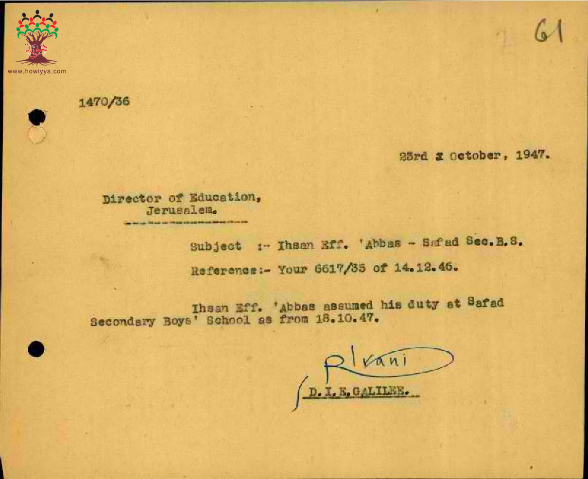 رسائل بخصوص مباشرة المعلم إحسان عباس عمله في مدرسة صفد
