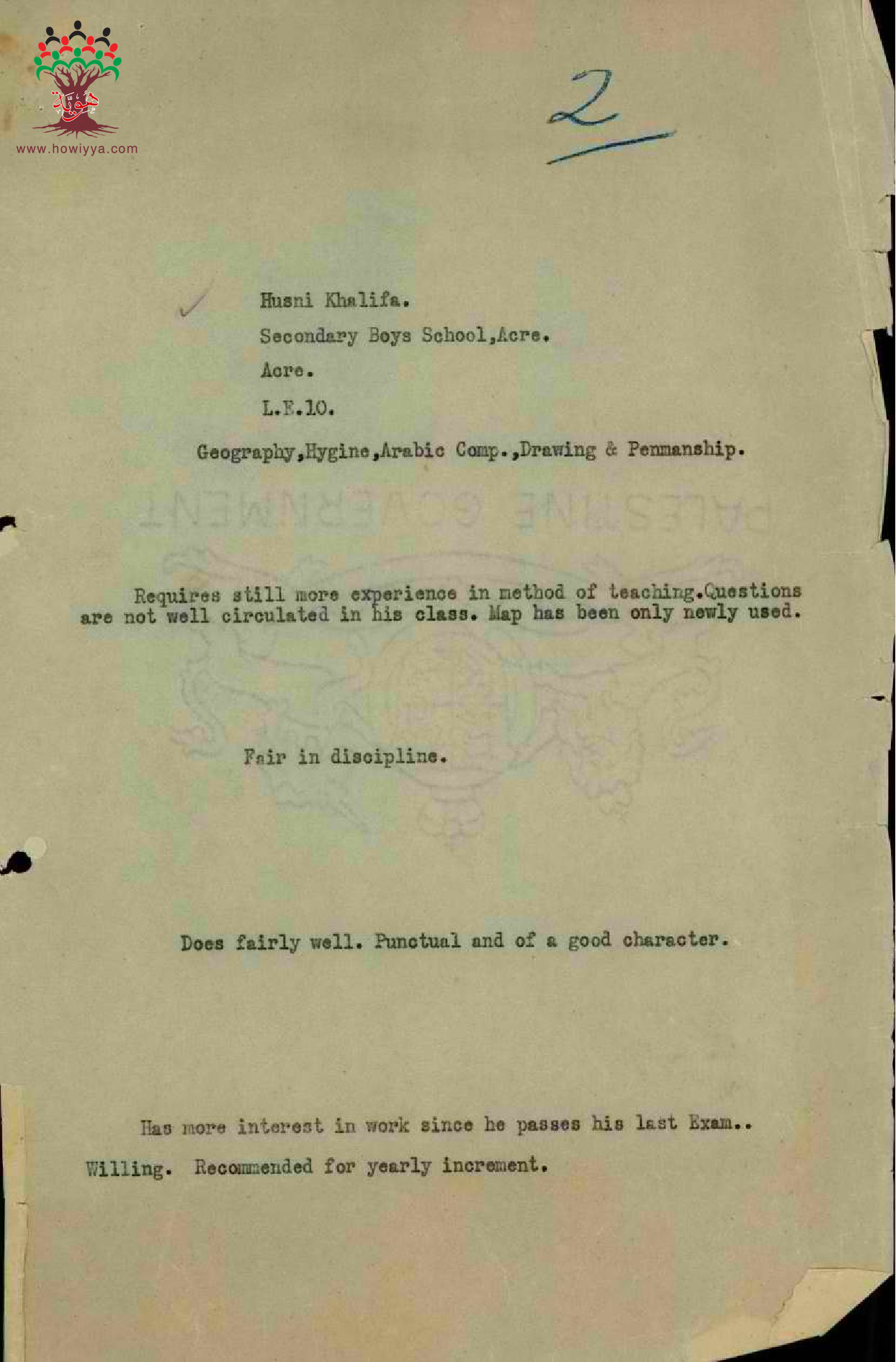 تقرير عن أداء المعلم حسني خليفة في مدرسة عكا سنة 1922
