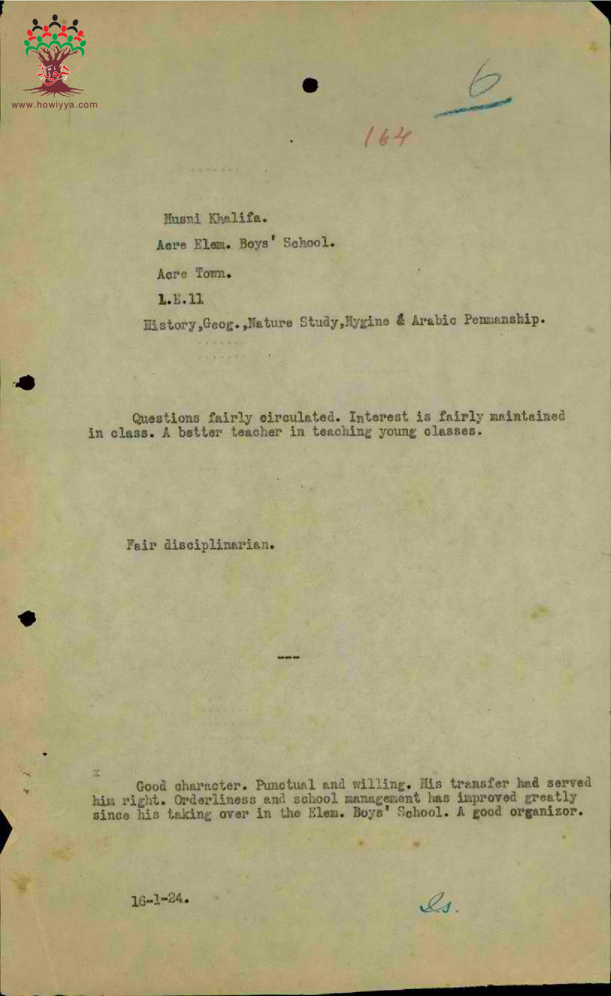 تقرير عن أداء المعلم حسني خليفة في مدرسة عكا سنة 1923