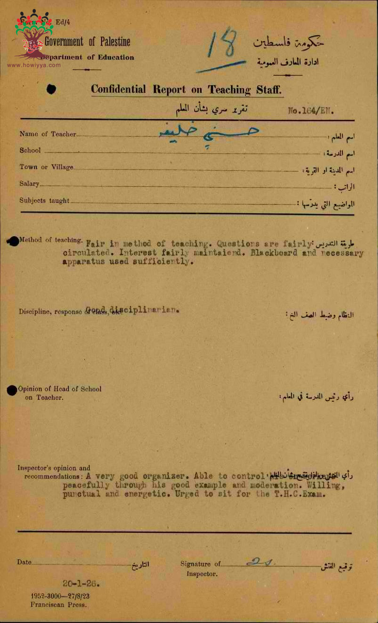 تقرير تفصيلي عن أداء المعلم حسني خليفة في مدرسة عكا سنة 1925