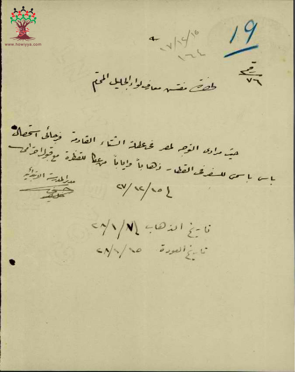 رسالة من المعلم حسني خليفة الى مفتش المعارف يطلب فيها استمارة سفره السنوية