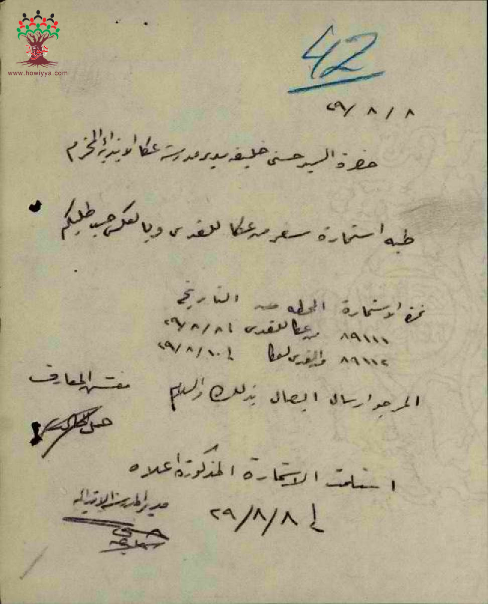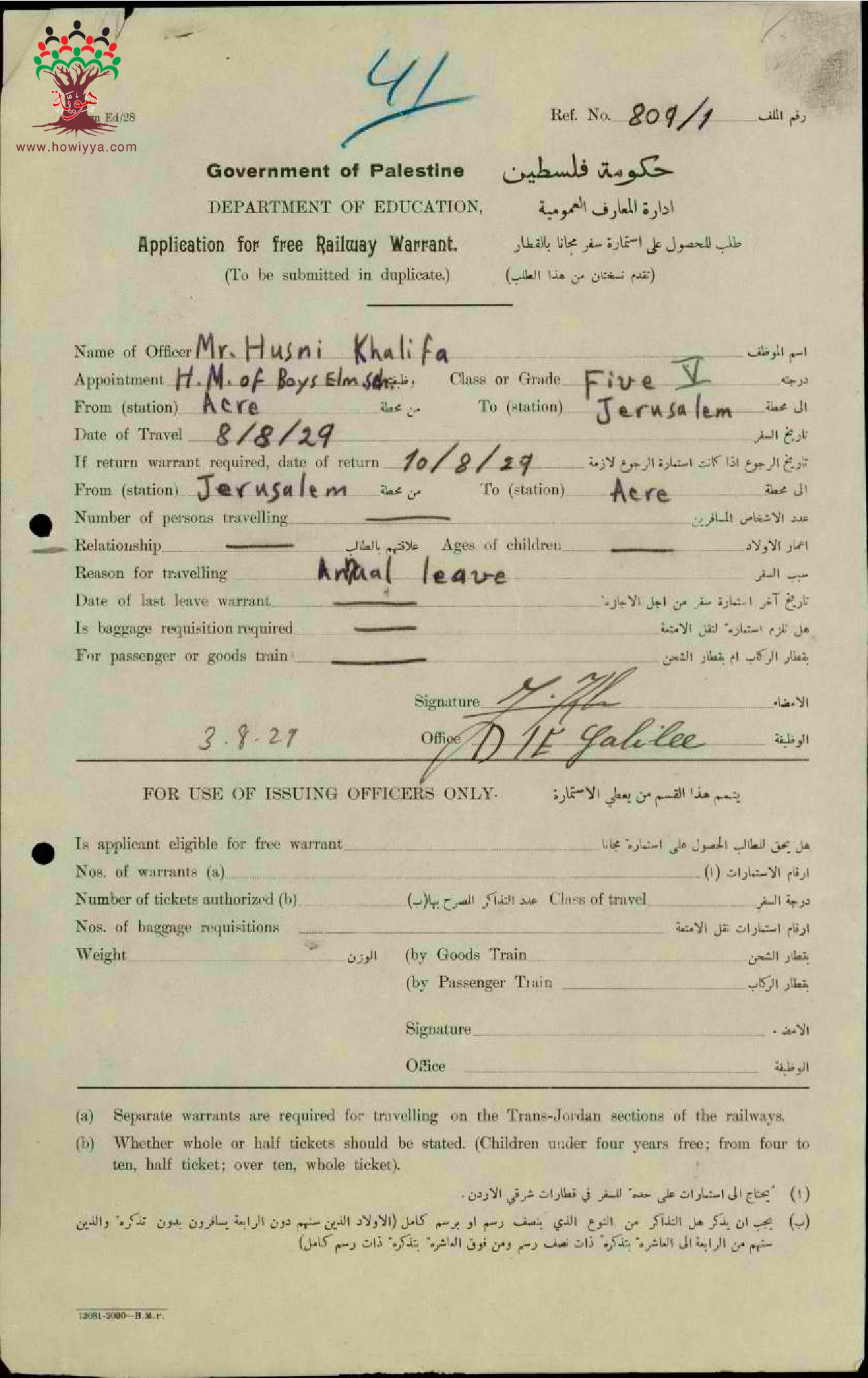 رسالة من مفتش المعارف الى المعلم حسني خليفة مرفقة بالستمارة سفره السنوية