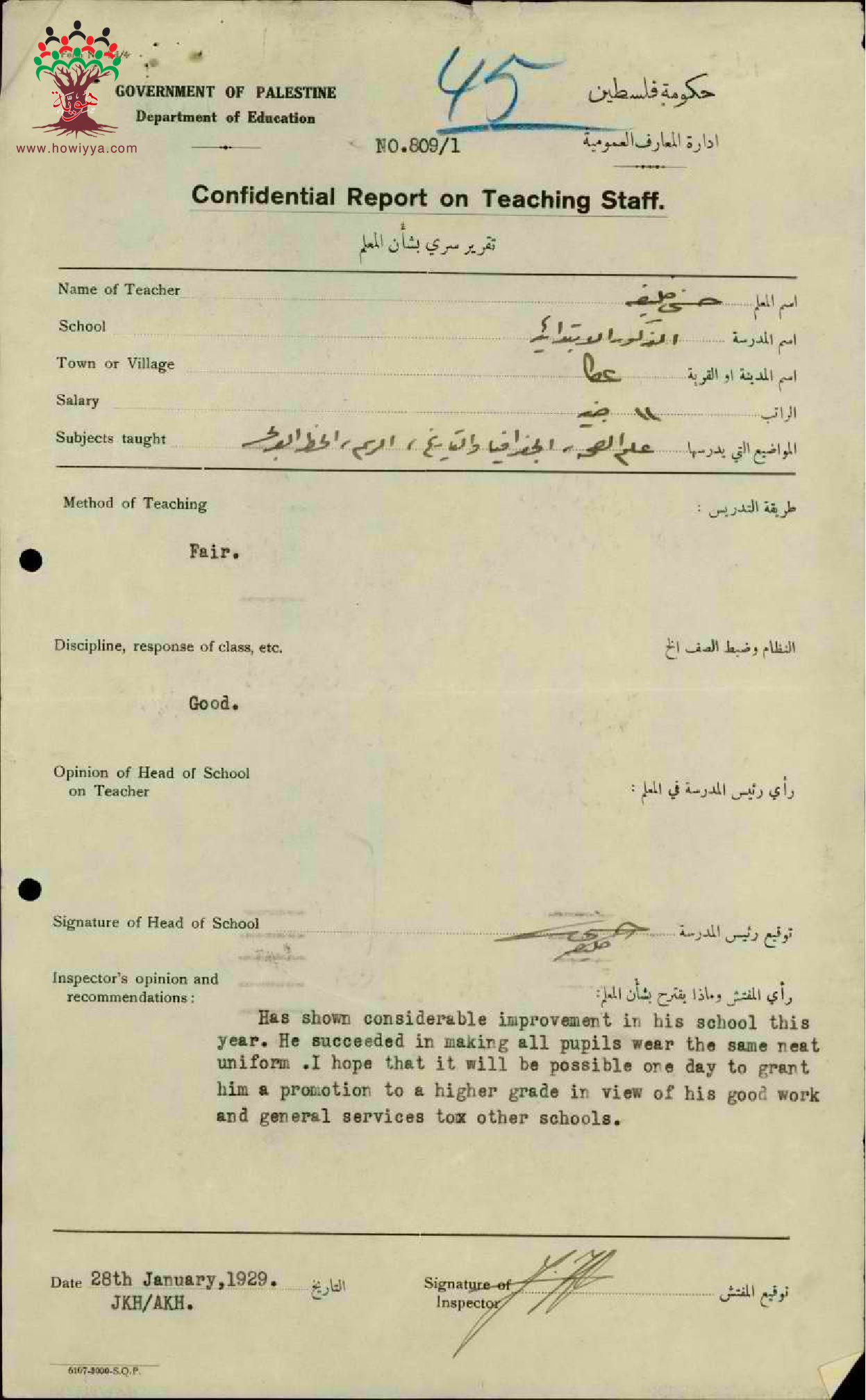 تقرير تفصيلي عن أداء المعلم حسني خليفة في مدرسة عكا سنة 1928