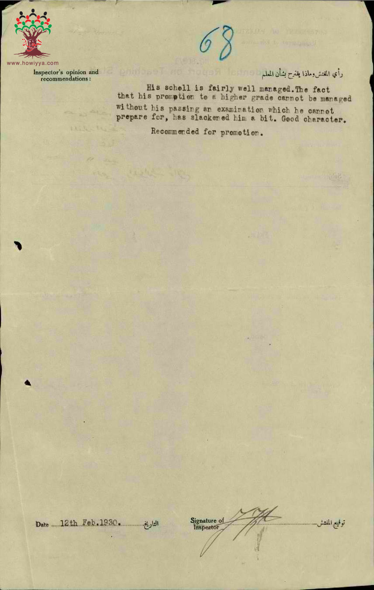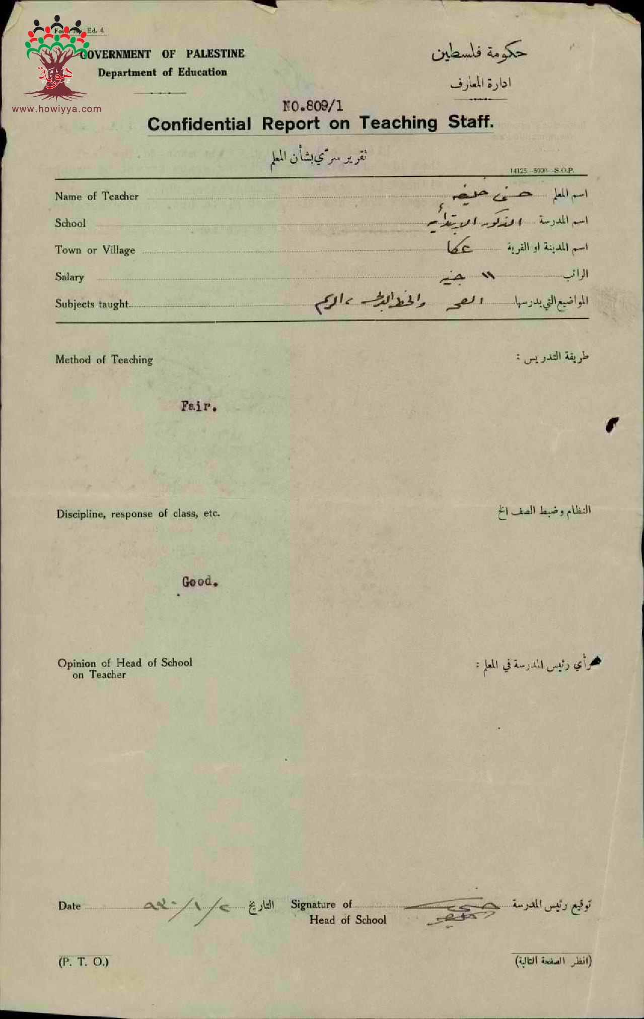 تقرير تفصيلي عن أداء المعلم حسني خليفة في مدرسة عكا سنة 1929
