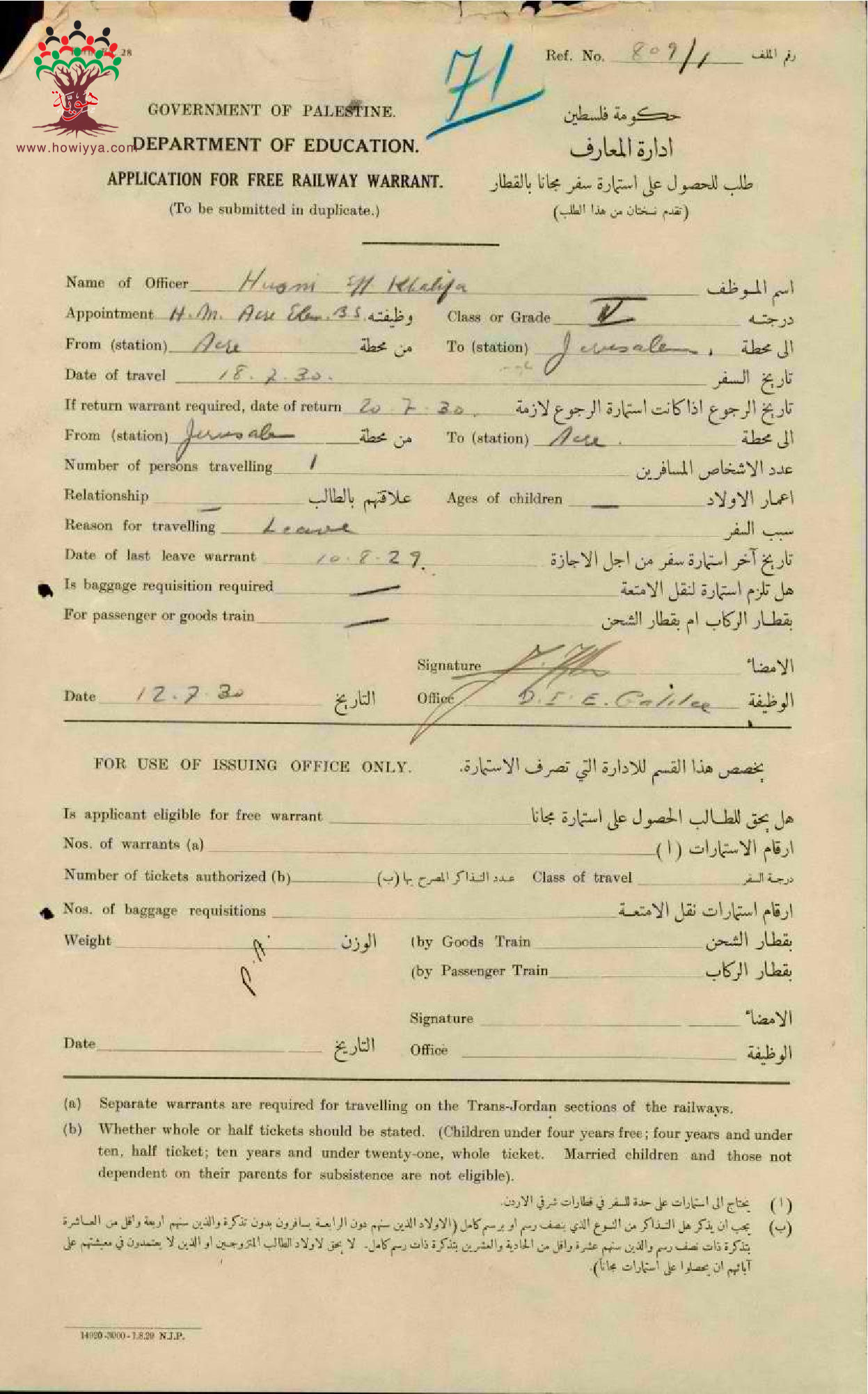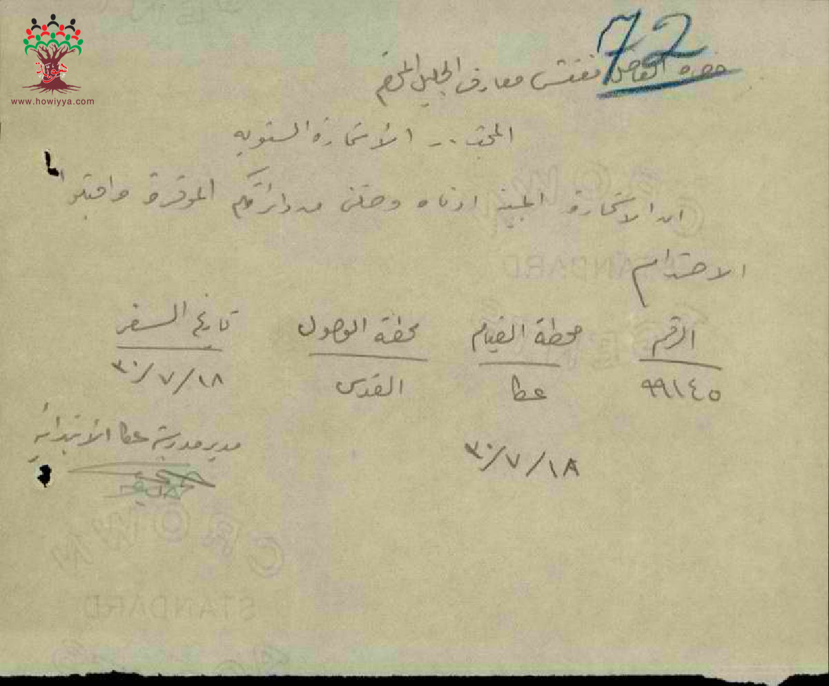رسالة من مفتش المعارف الى المعلم حسني خليفة مرفقة باستمارة سفره السنوية