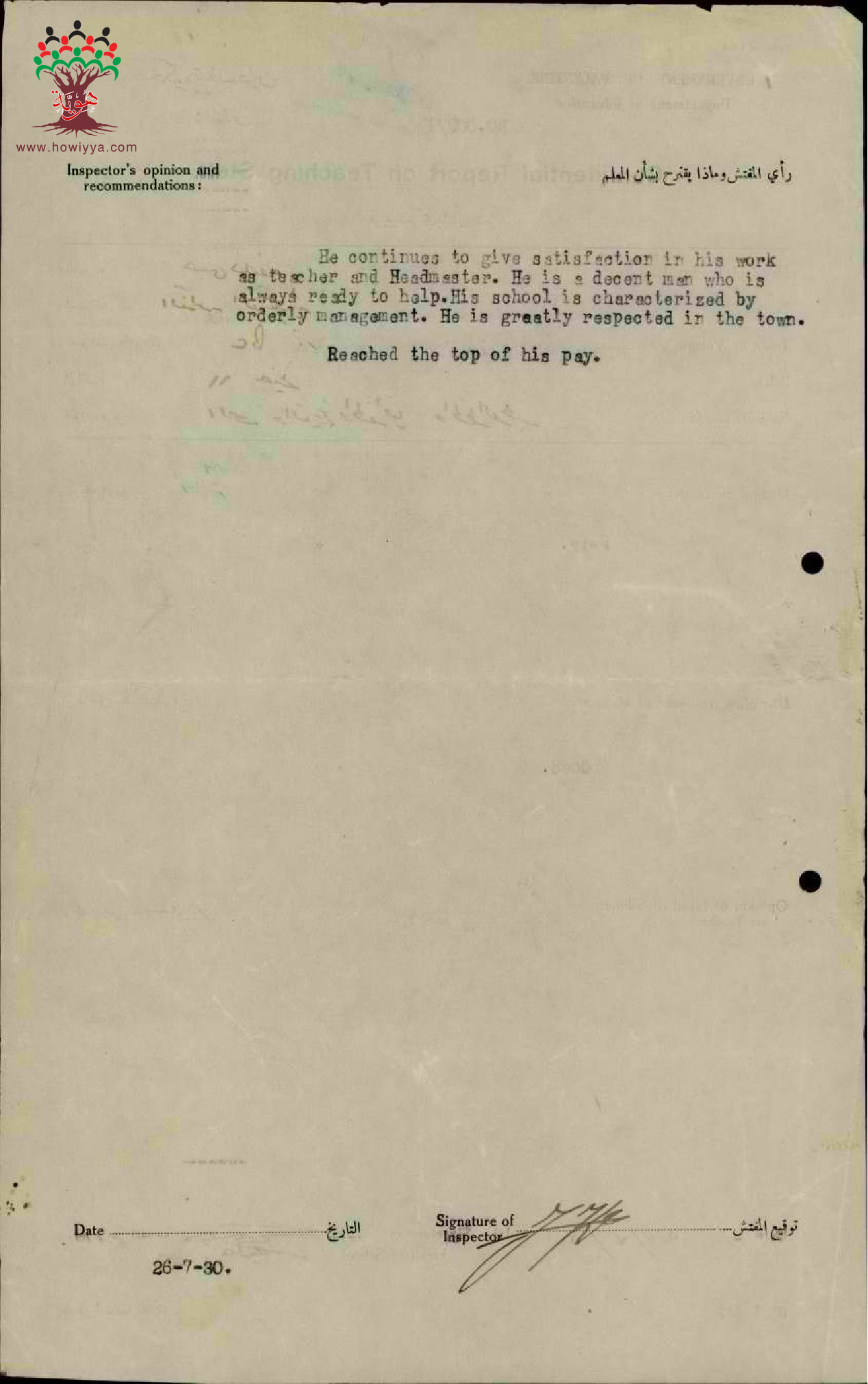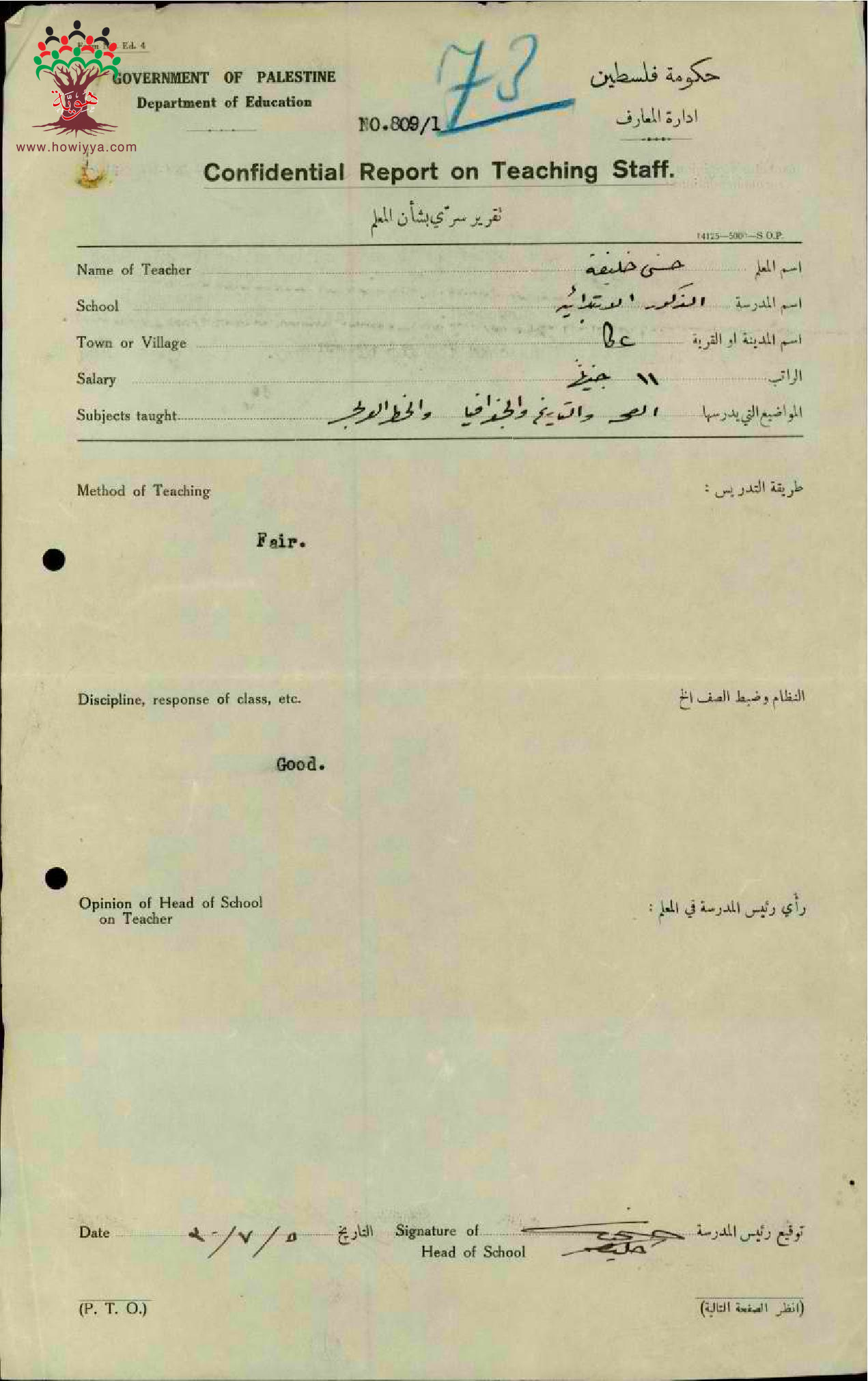 تقرير تفصيلي عن أداء المعلم حسني خليفة في مدرسة عكا سنة 1930