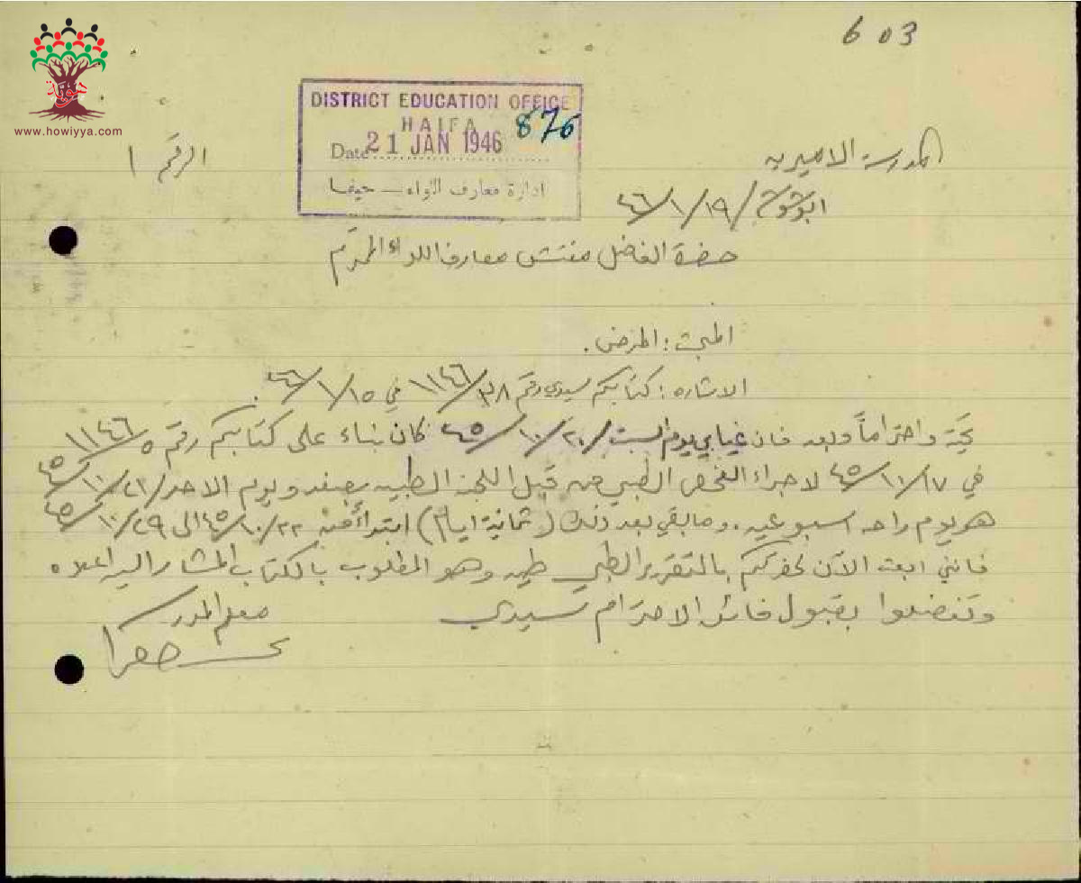 رسالة من المعلم نجيب الخضرا الى مفتش المعارف بخصوص التقرير الطبي المطلوب منه