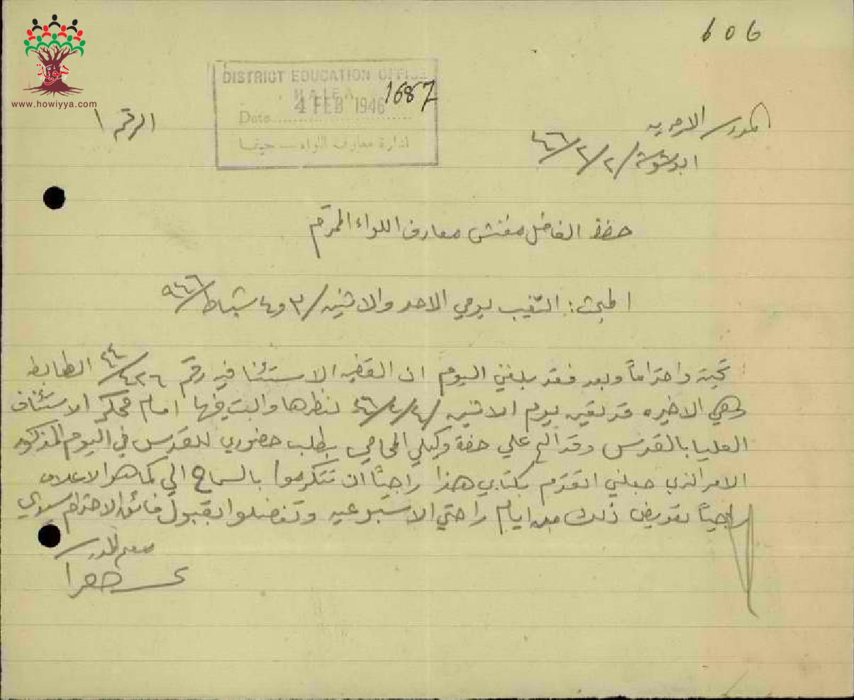 رسالة من المعلم نجيب الخضرا الى مفتش المعارف يطلب اذن للغياب لحضور استئناف المحكمة العليا بالقدس