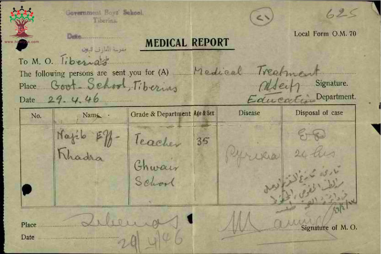 تقرير طبي عن غياب المعلم نجيب الخضرا-مدرسة غوير أبو شوشة