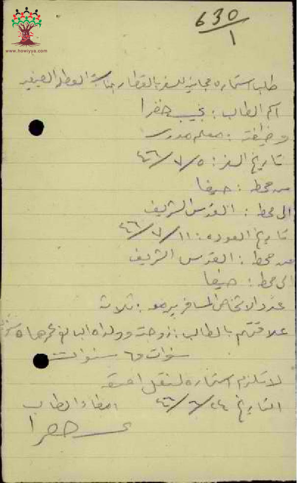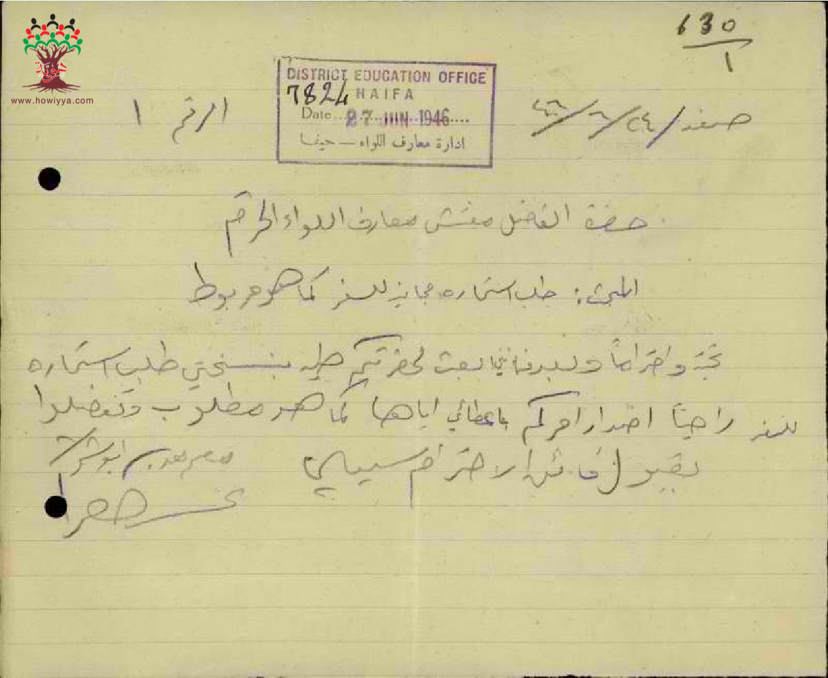 رسالة من المعلم نجيب الخضرا الى مفتش المعارف مرفقة بطلب استمارة سفره