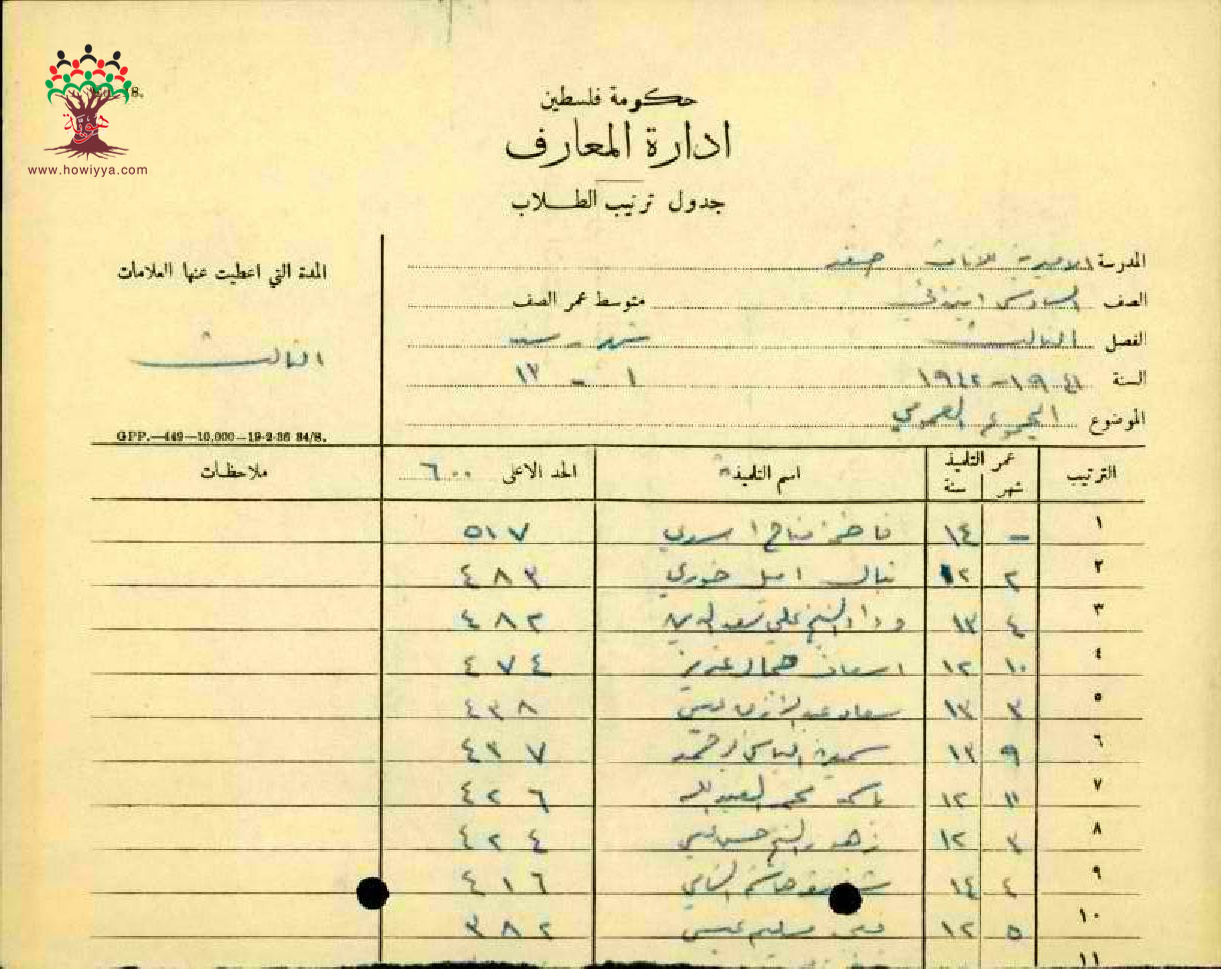علامات المجموع العام لمدرسة صفد الاميرية - صف السادس - اناث - 1942