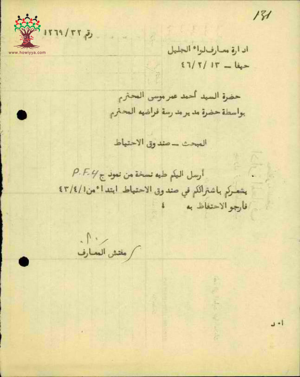 اشتراك الاستاذ احمد عمر موسى في صندوق الاحتياط - صفد - مدرسة فرادة
