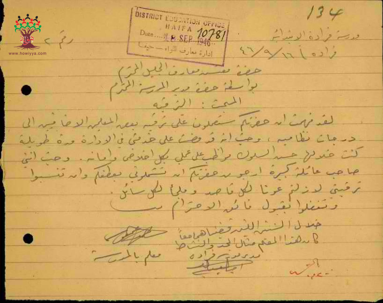 طلب ترقية مقدم من قبل المعلم احمد عمر موسى - مدرسة فرادة - صفد