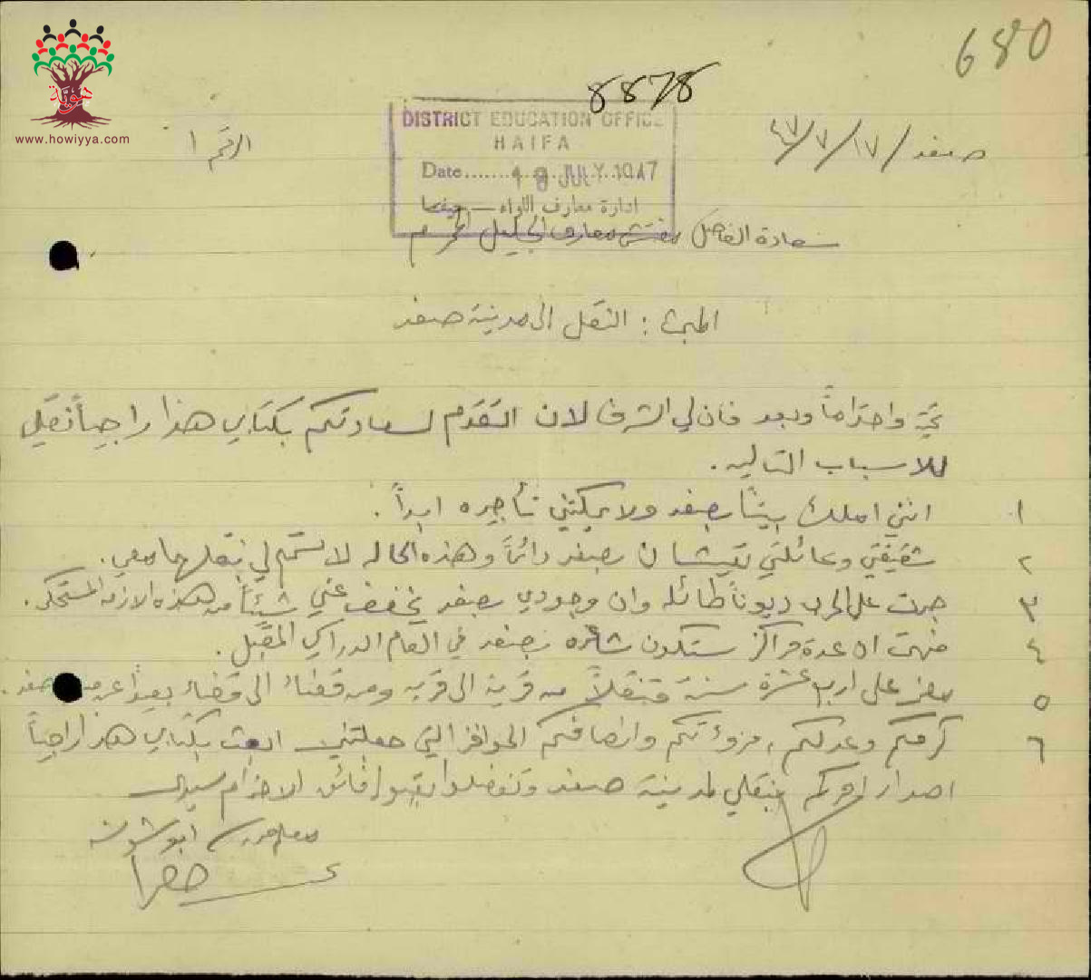 رسالة من المعلم نجيب الخضرا الى مفتش المعارف يطلب فيها نقله من مدرسة غوير أبو شوشة الى صفد