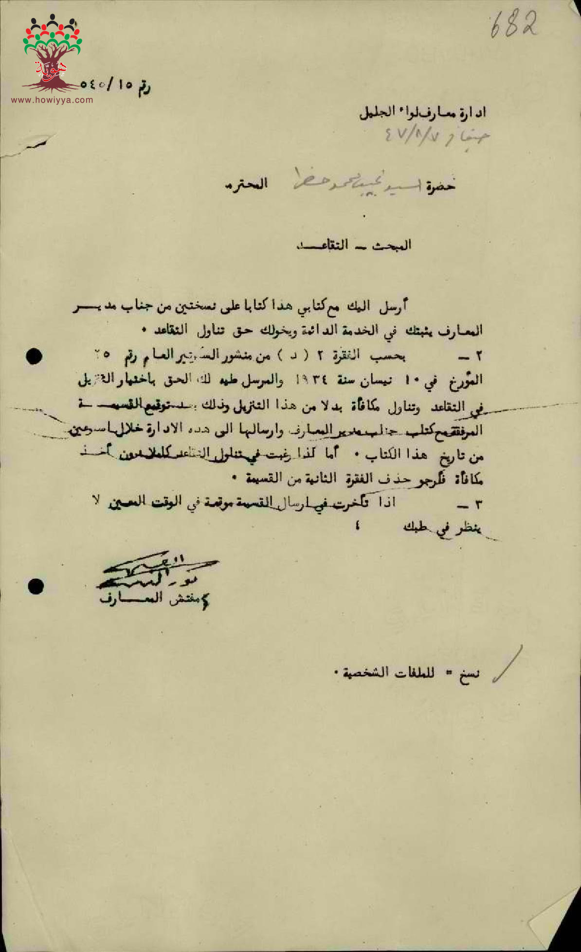رسالة من مفتش المعارف الى المعلم نجيب الخضرا بخصوص حقه في تناول تقاعده