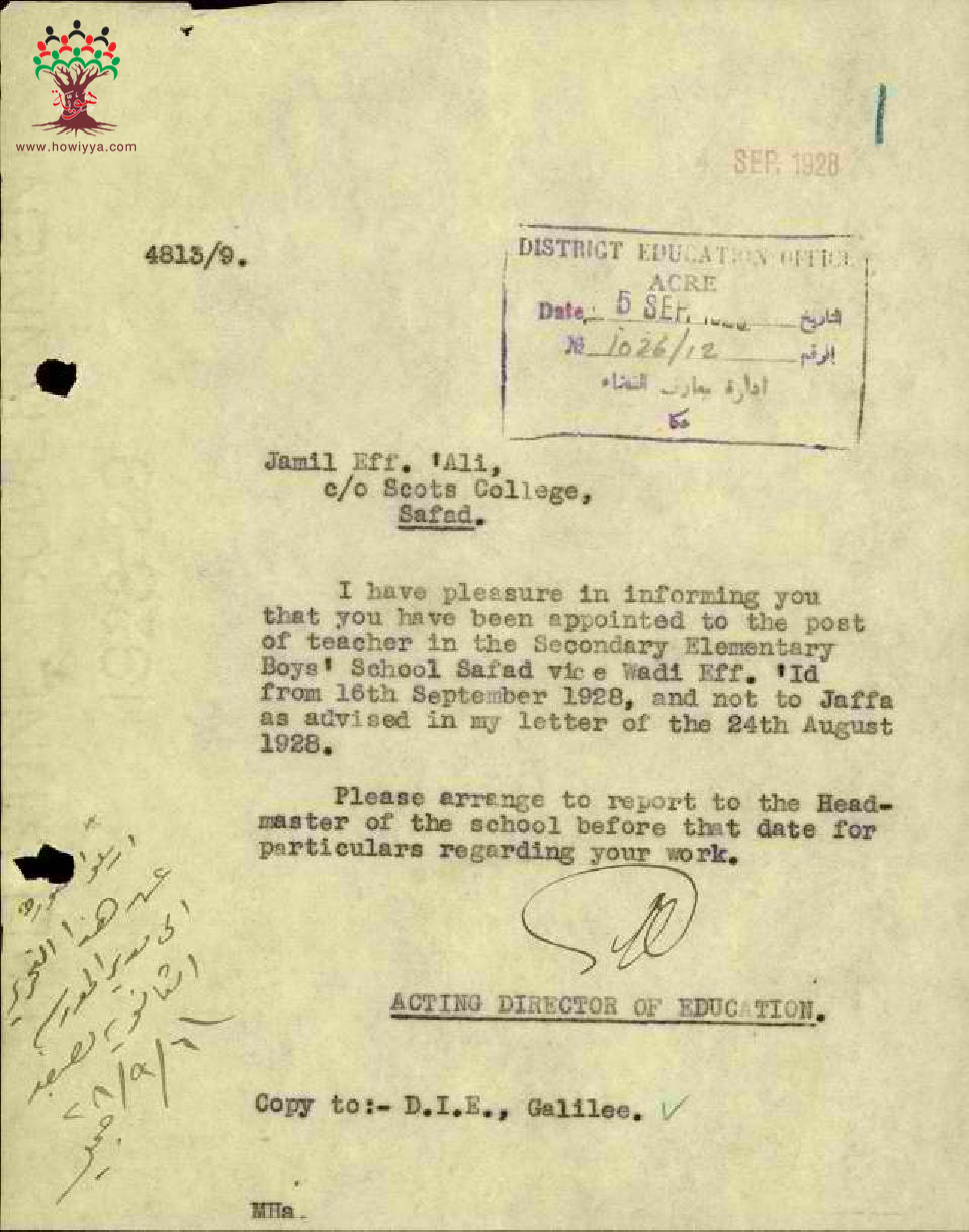رسالة من مفتش المعارف الى المعلم جميل الشيخ علي بخصوص تعيينه في مدرسة صفد