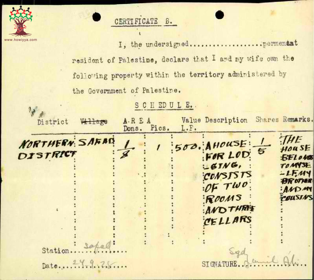 شهادة اثبات ملكية-المعلم جميل علي/صفد