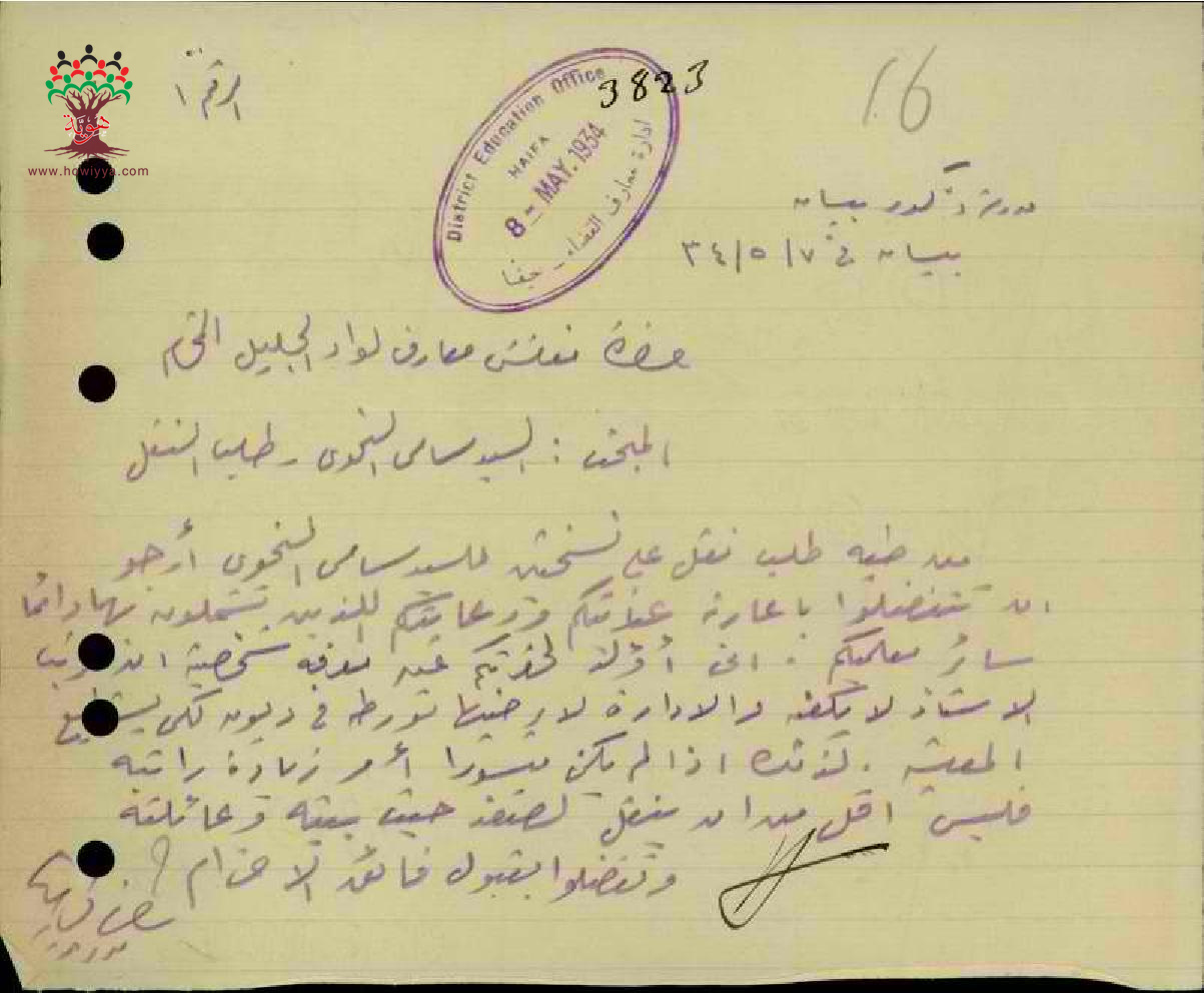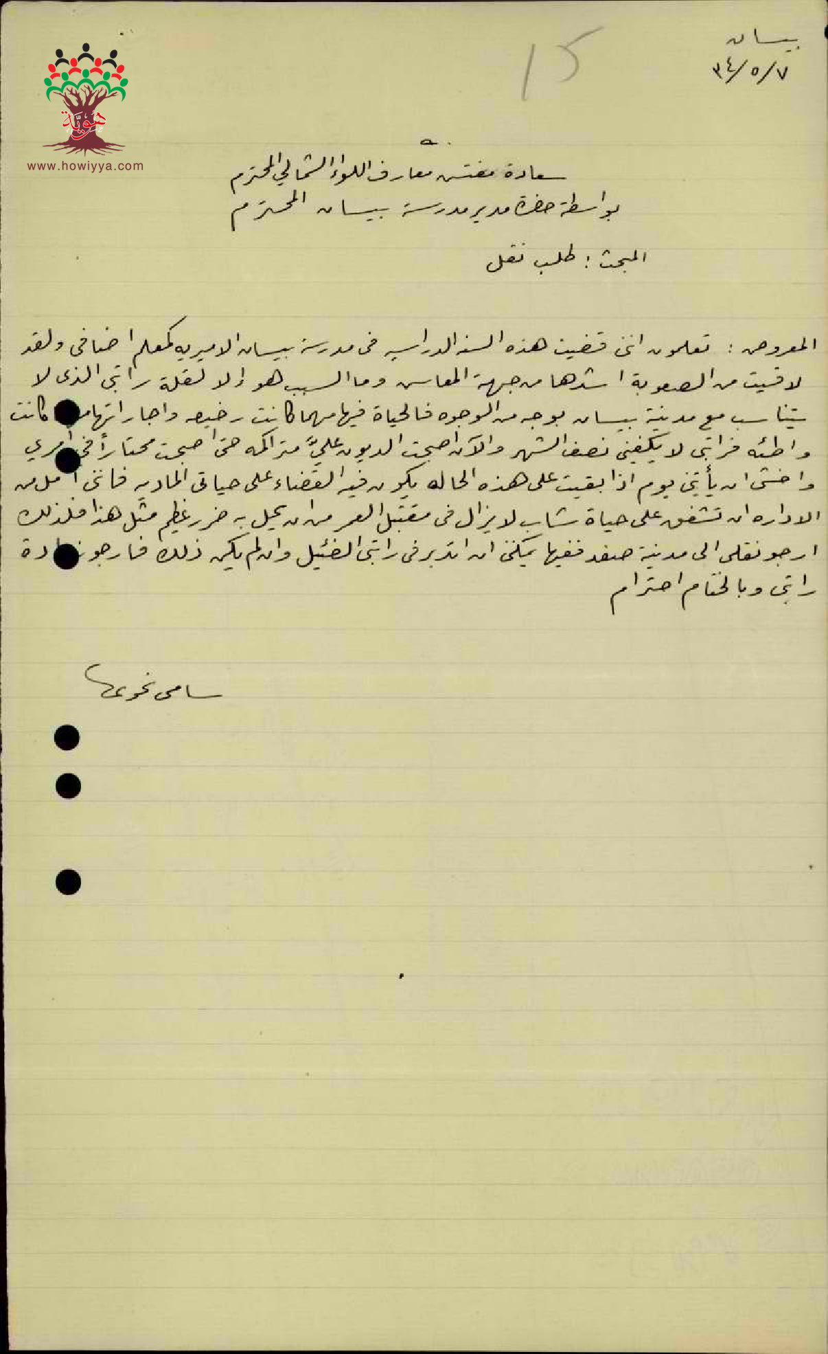طلب نقل مقدم من قبل المعلم سامي سعيد النحوي من بيسان الى صفد - صفد - مدرسة بيسان
