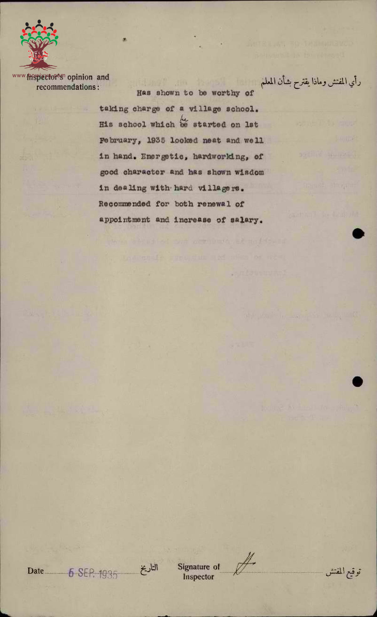 رأي المفتش العام بالمعلم المعلم سامي سعيد النحوي - صفد - مدرسة بيسان