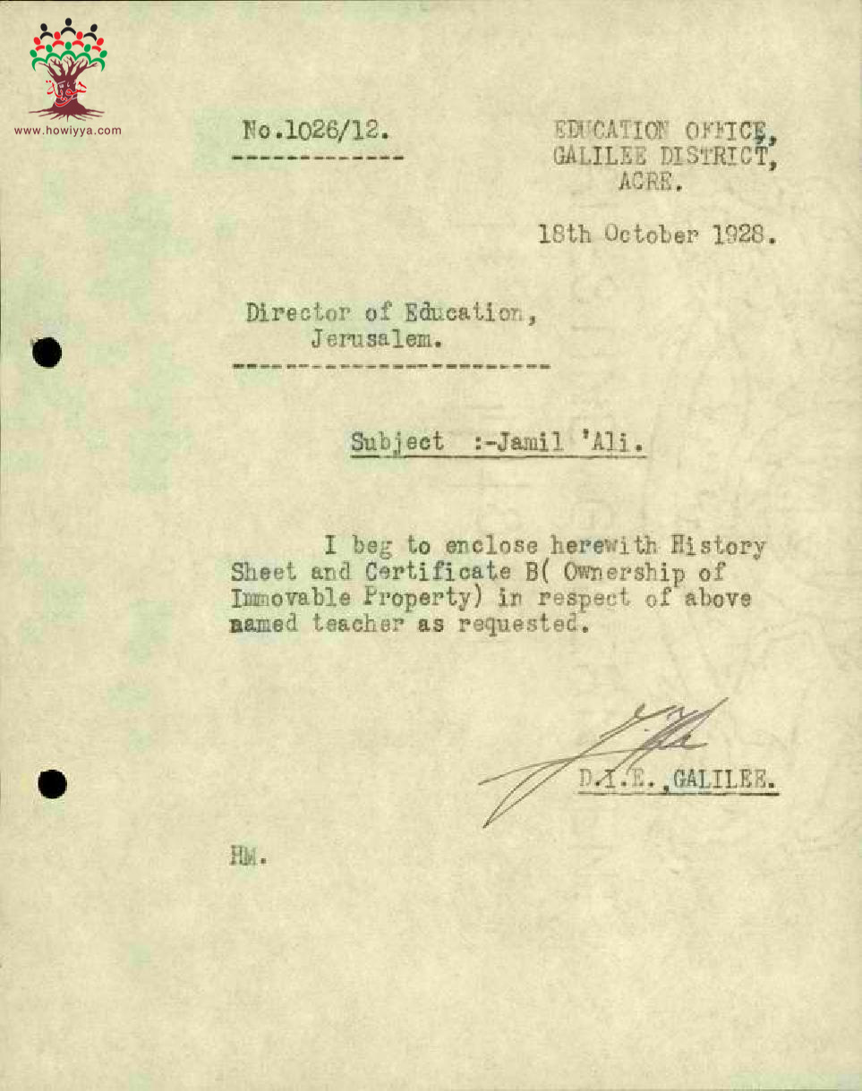 رسالة من مفتش المعارف الى مدير المعارف بخصوص أوراق تعيين المعلم جميل علي