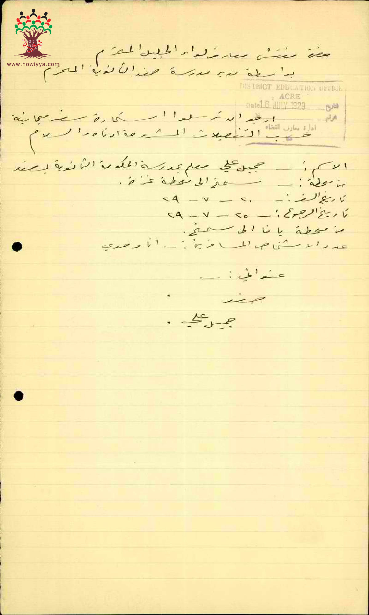 رسالة من المعلم جميل علي الى مفتش المعارف يطلب فيه استمارة سفره
