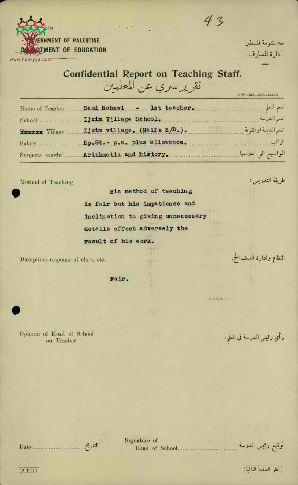 رأي مدير مدرسة اجزم بالمعلم المعلم سامي سعيد النحوي - صفد - مدرسة اجزم