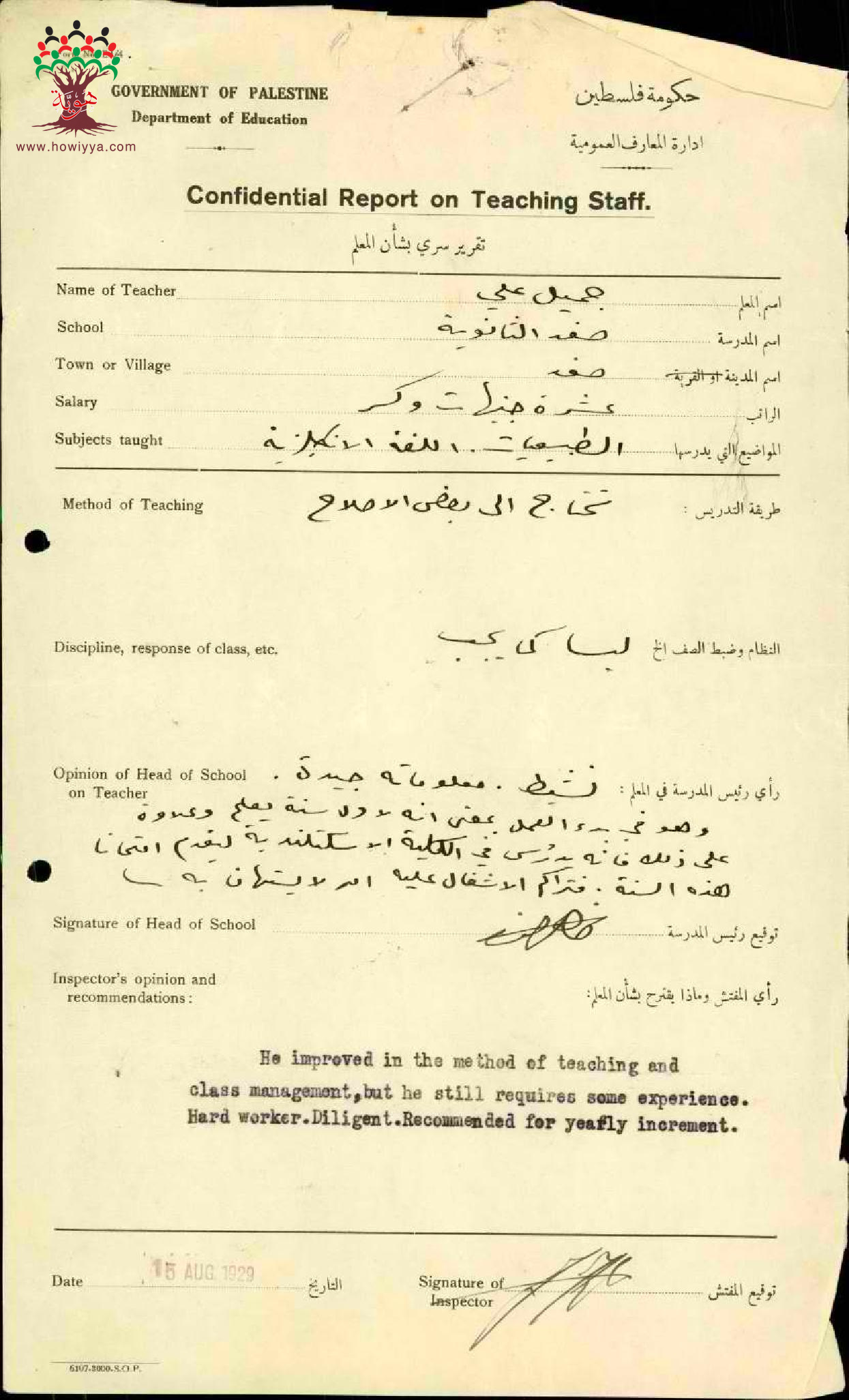 تقرير تفصيلي عن أداء المعلم جميل علي في مدرسة صفد سنة 1929