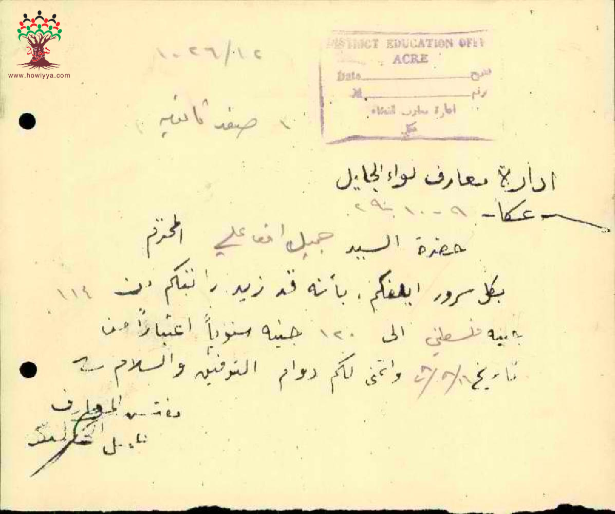 رسالة من مفتش المعارف الى المعلم جميل علي بخصوص زيادة راتبه السنوية
