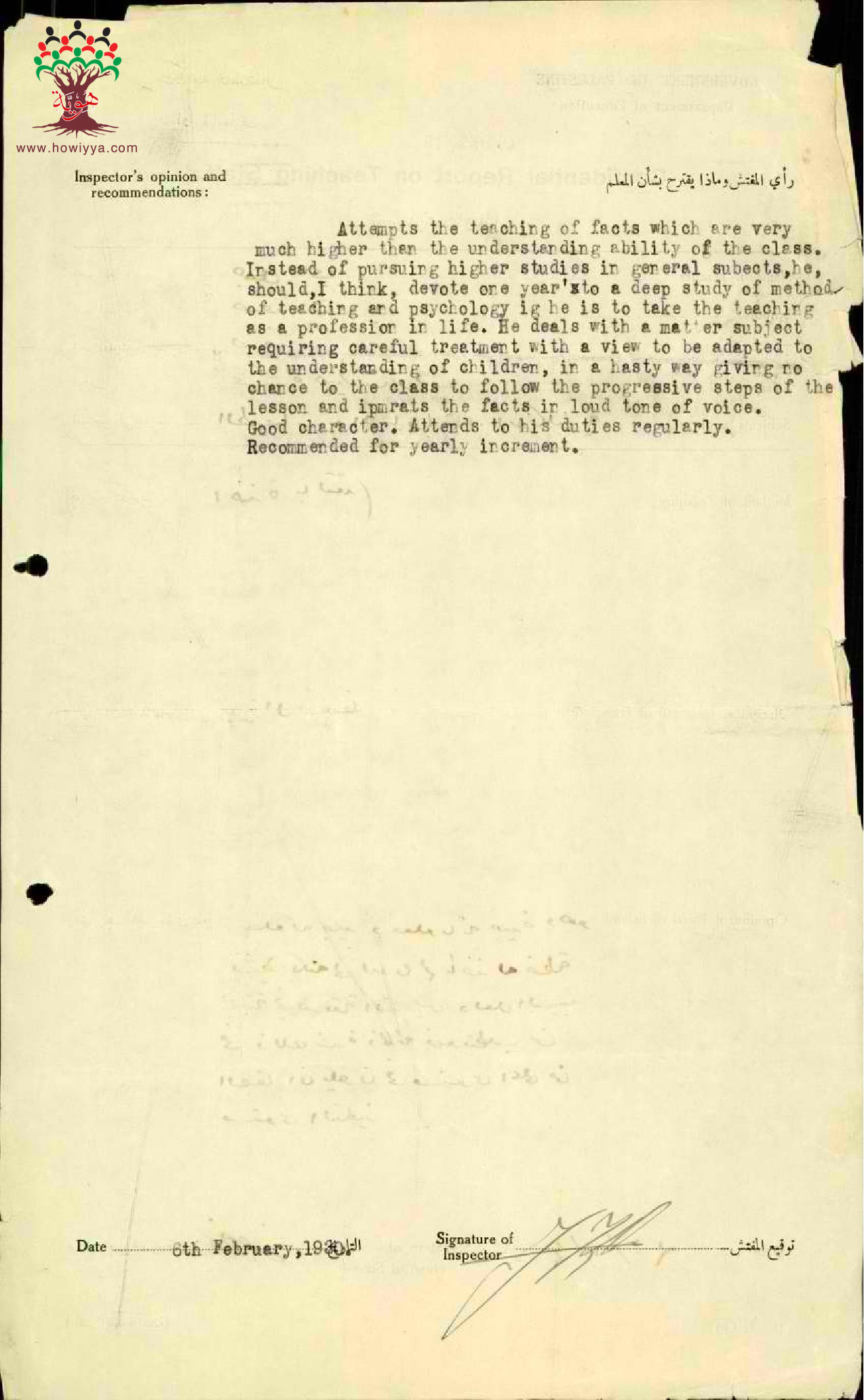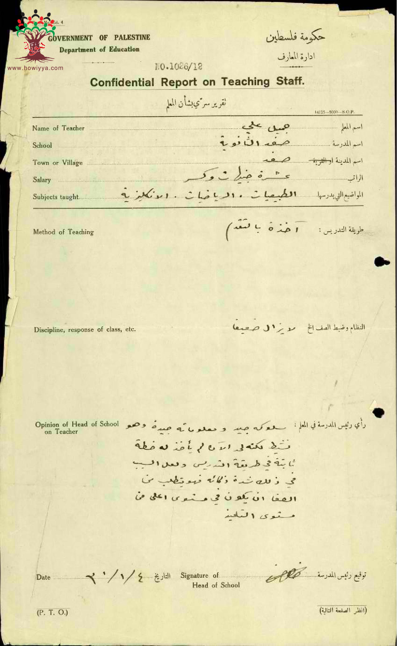 تقرير تفصيلي عن أداء المعلم جميل علي في مدرسة صفد سنة 1929