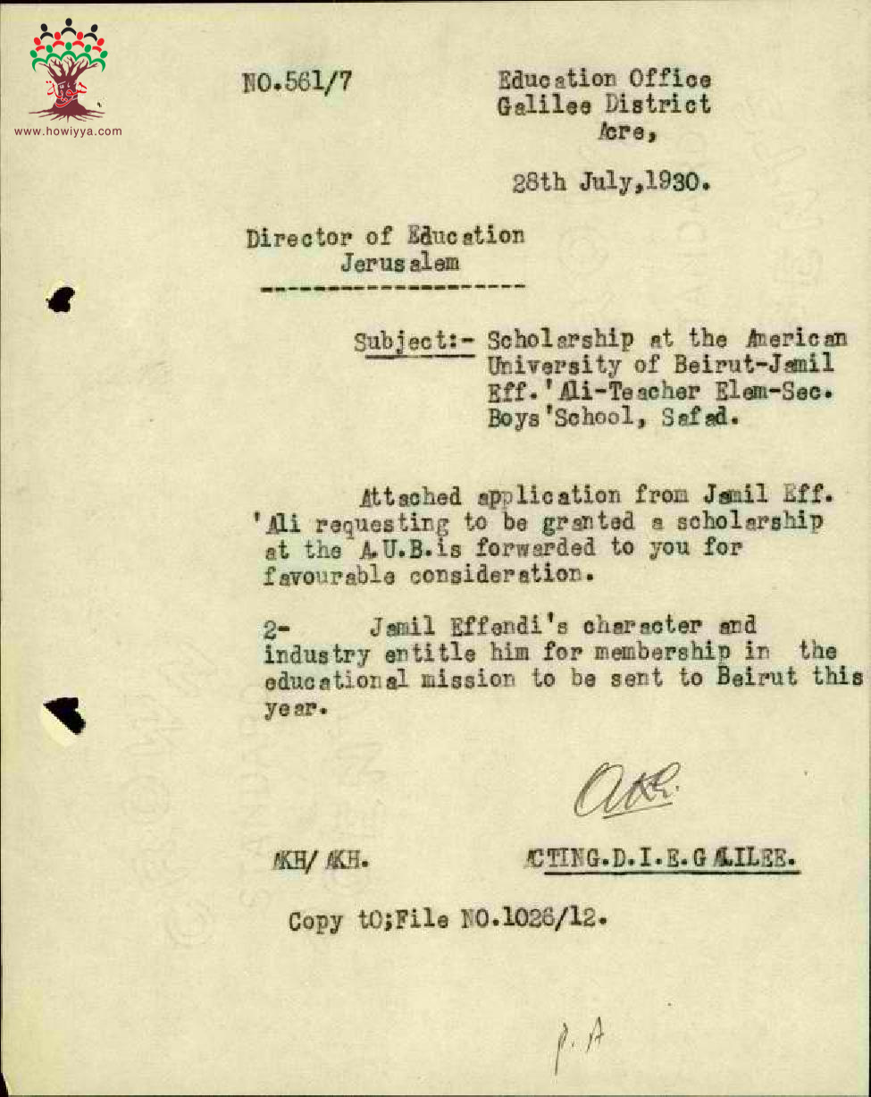 رسالة من مفتش المعارف الى مدير المعارف بخصوص طلب المعلم جميل علي للحصول على منحة الى الجامعة الأميركية في بيروت