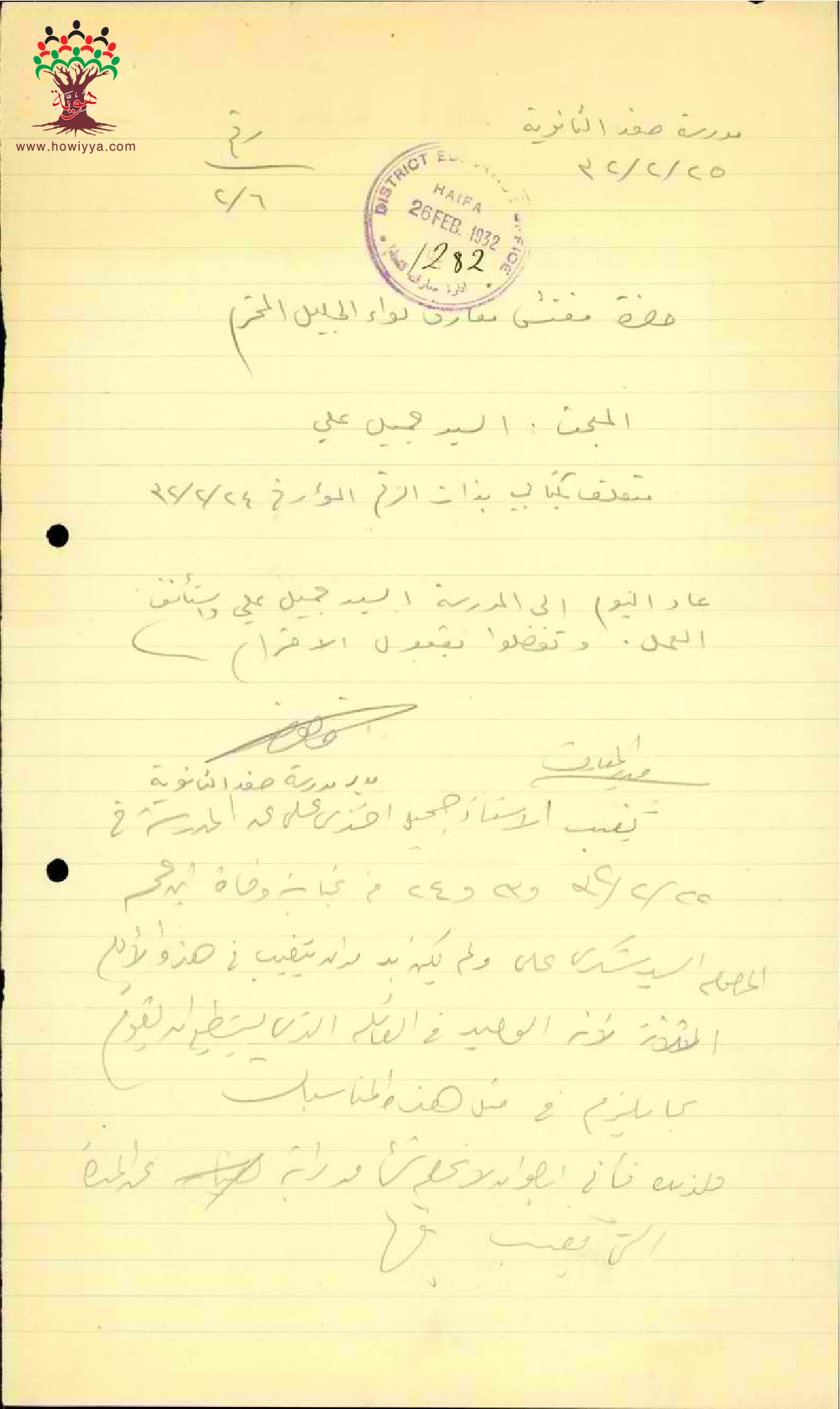 رسالة من مدير مدرسة صفد الى مفتش المعارف بخصوص عودة المعلم جميل علي الى العمل