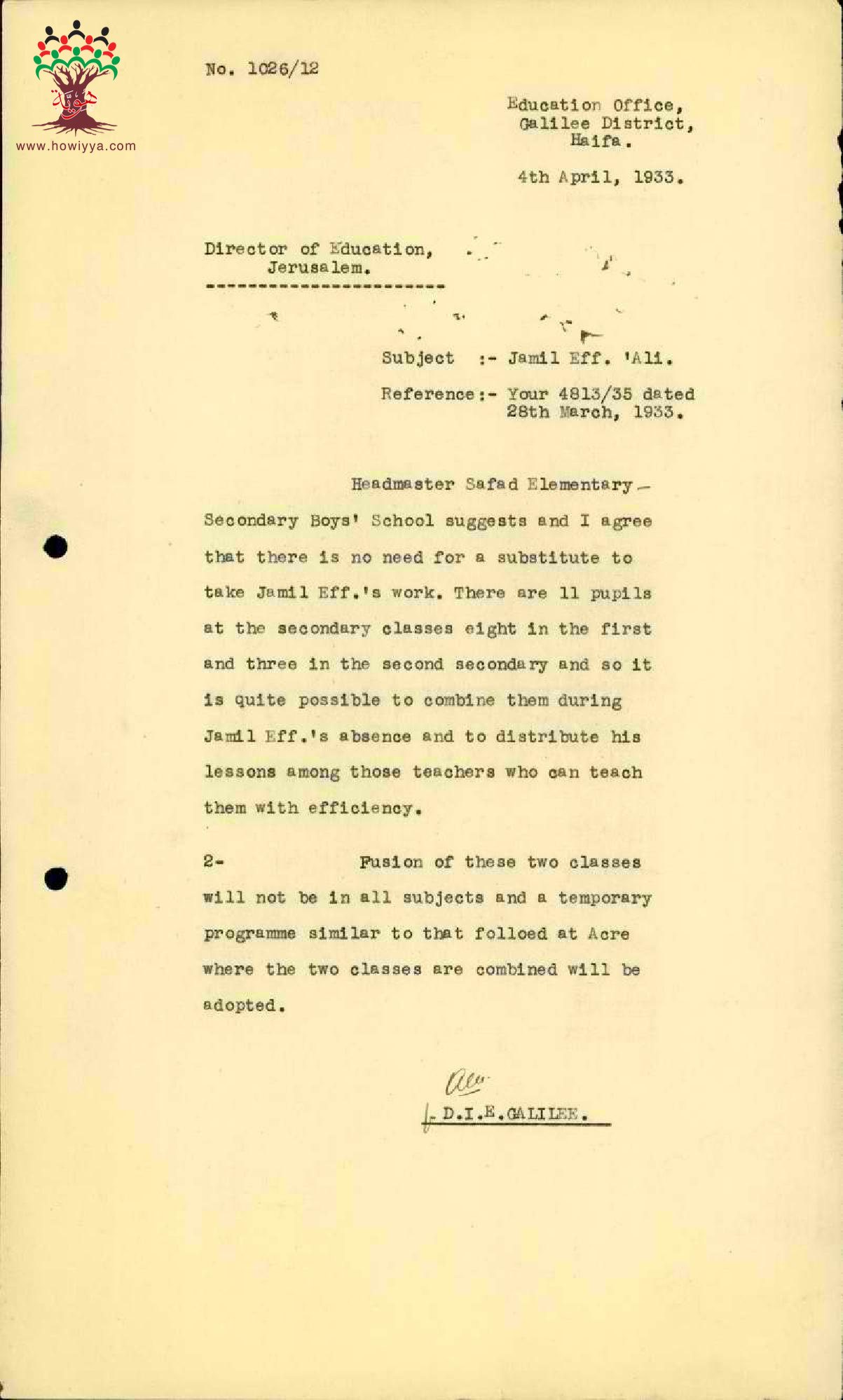 رسالة من مفتش المعارف الى مدير المعارف بخصوص دمج صفين الثانوي في مدرسة صفد خلال فترة غياب المعلم جميل علي