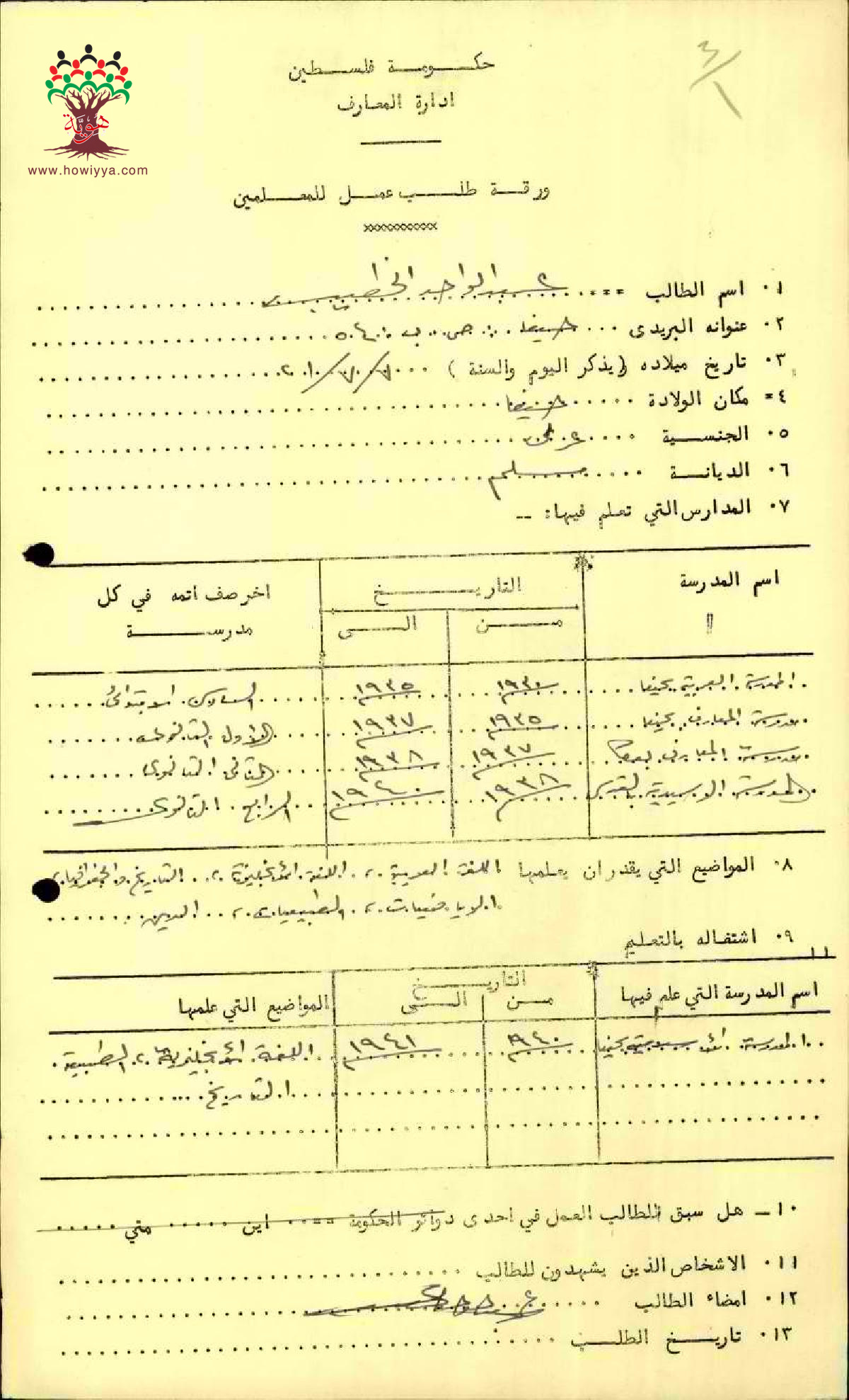 طلب عمل معلمين مقدم من المعلم عبدالواحد يونس الخطيب - حيفا - مدرسة كفرمندا