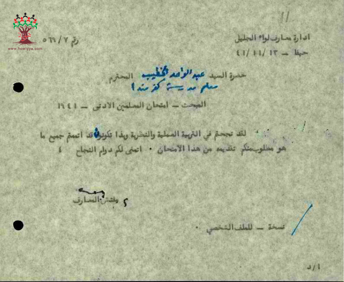 نجاج المعلم عبدالواحد يونس الخطيب في امتحان المعلمين الادنى - حيفا - مدرسة كفرمندا