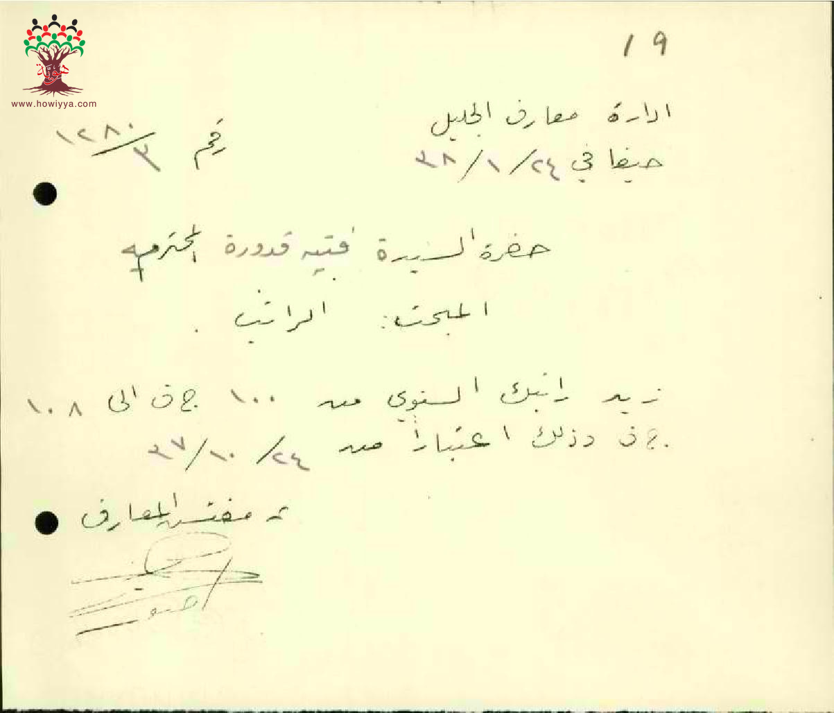 رسالة من مفتش المعارف الى المعلمة فتية قدورة بخصوص زيادة راتبها السنوية