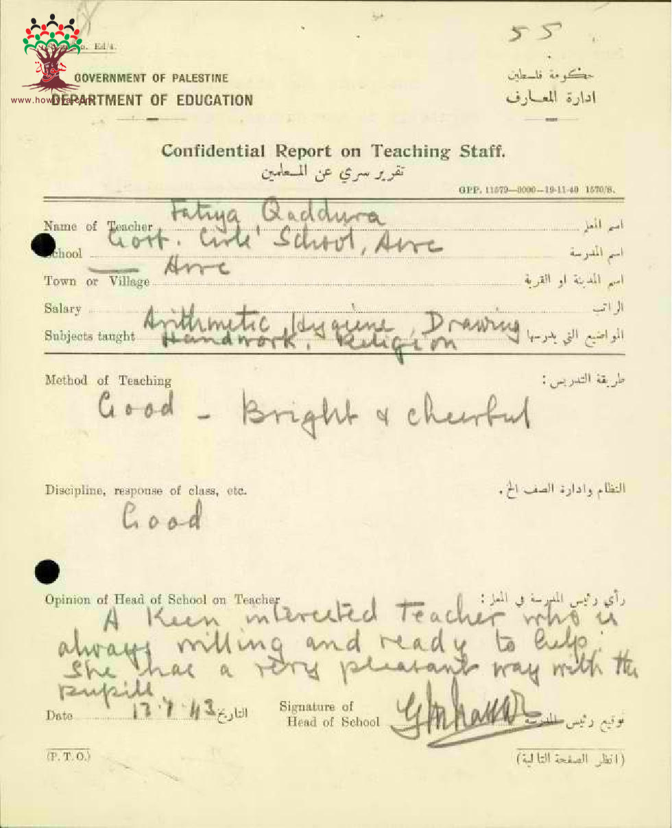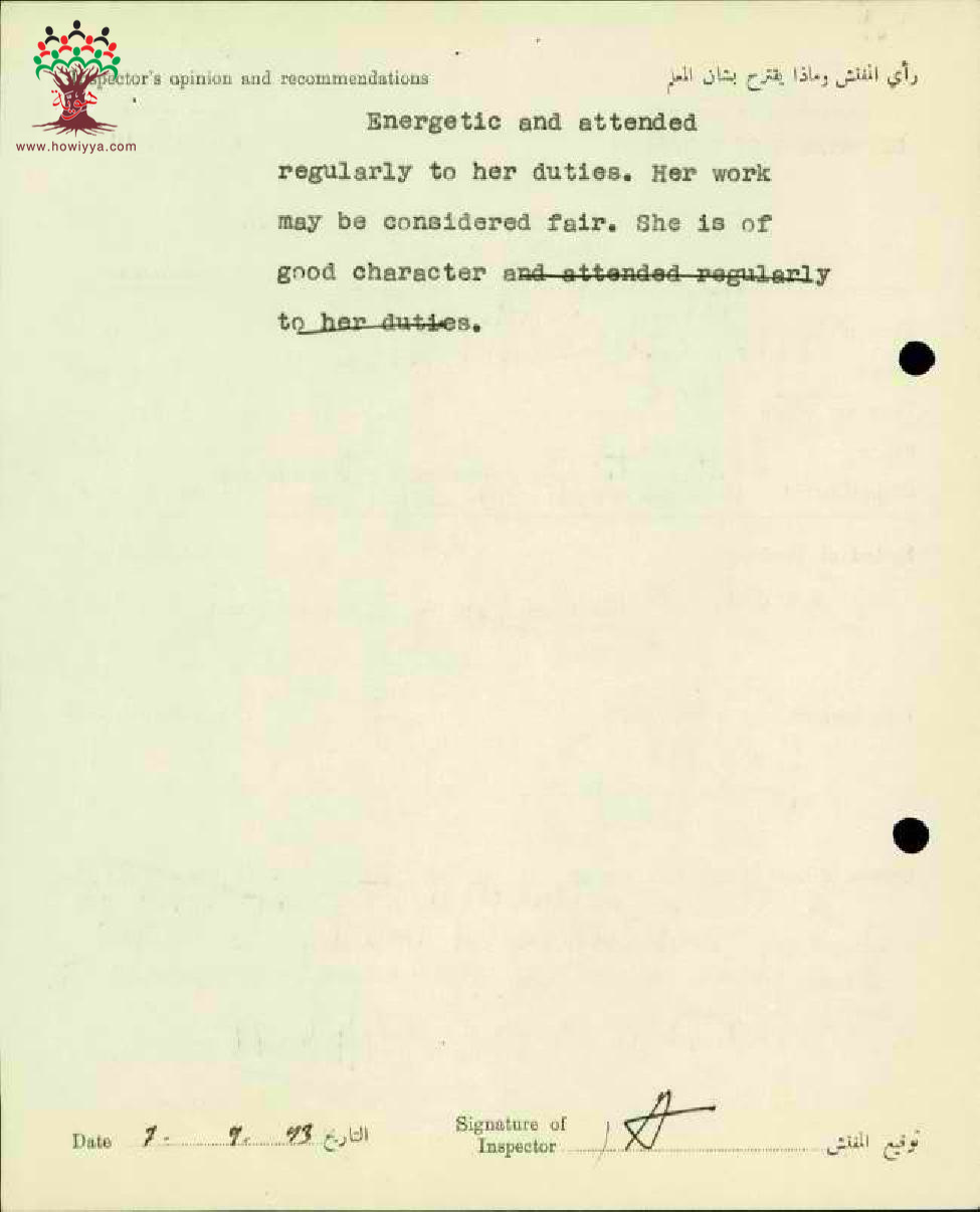 تقرير تفصيلي عن أداء المعلمة فتية أسعد قدورة في مدرسة بنات عكا سنة 1943