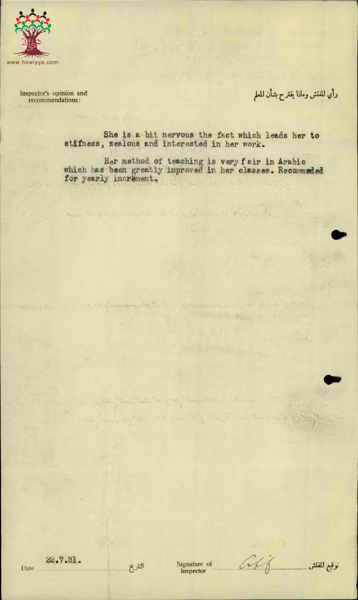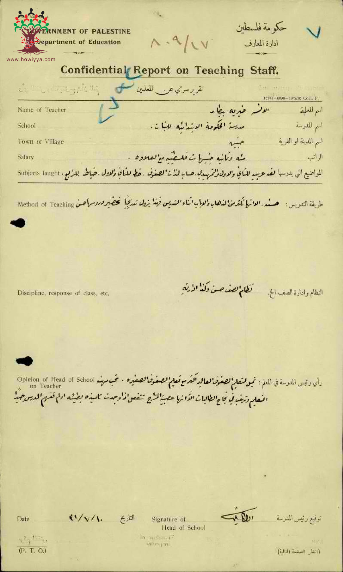 تقرير تفصيلي عن أداء المعلمة خيرية بيطار في مدرسة جنين سنة 1931