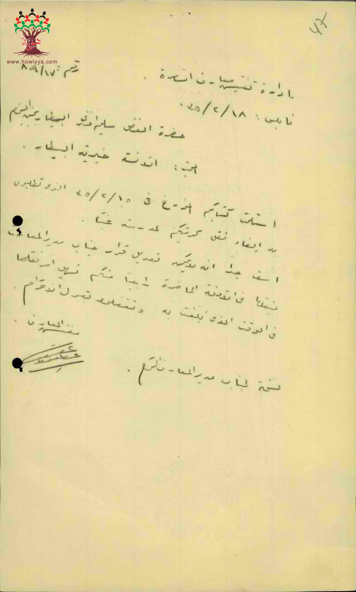 رسالة من مفتش المعارف الى والد المعلمة خيرية بيطار يخبره بأنه لا يمكن العدول عن نقل ابنته الى عنبتا