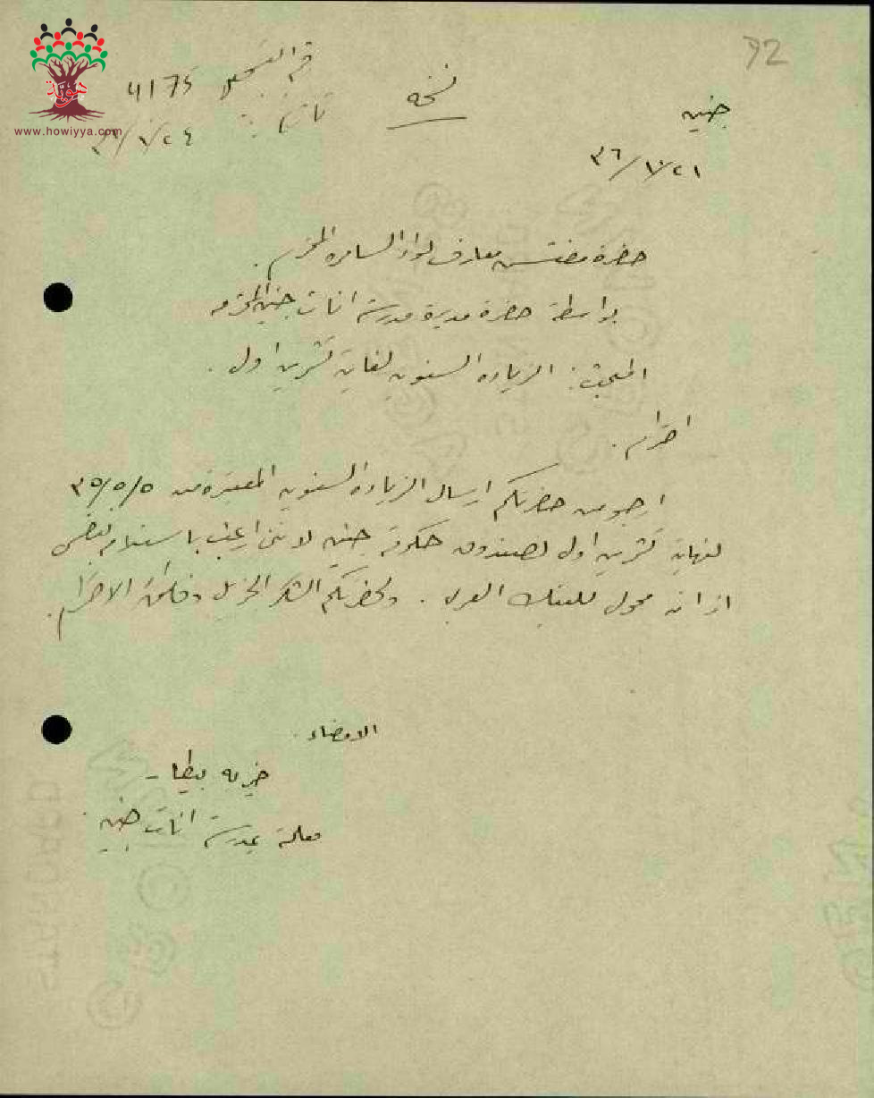 رسالة من المعلمة خيرية بيطار الى مفتش المعارف تطلب ارسال زيادتها السنوية الى صندوق حكومة جنين