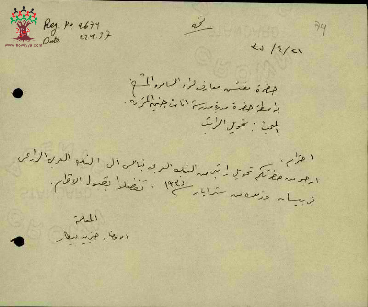 رسالة من المعلمة خيرية بيطار الى مفتش المعارف تطلب تحويا راتبها من البنك العربي بنابلس الى البنك العربي في بيسان